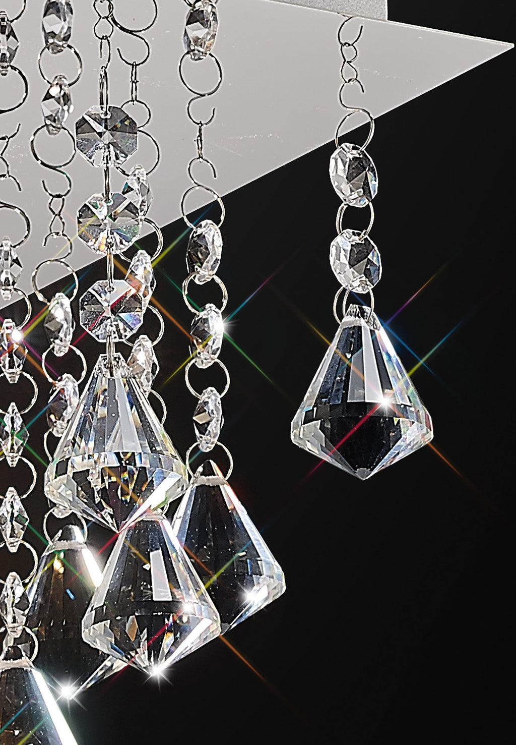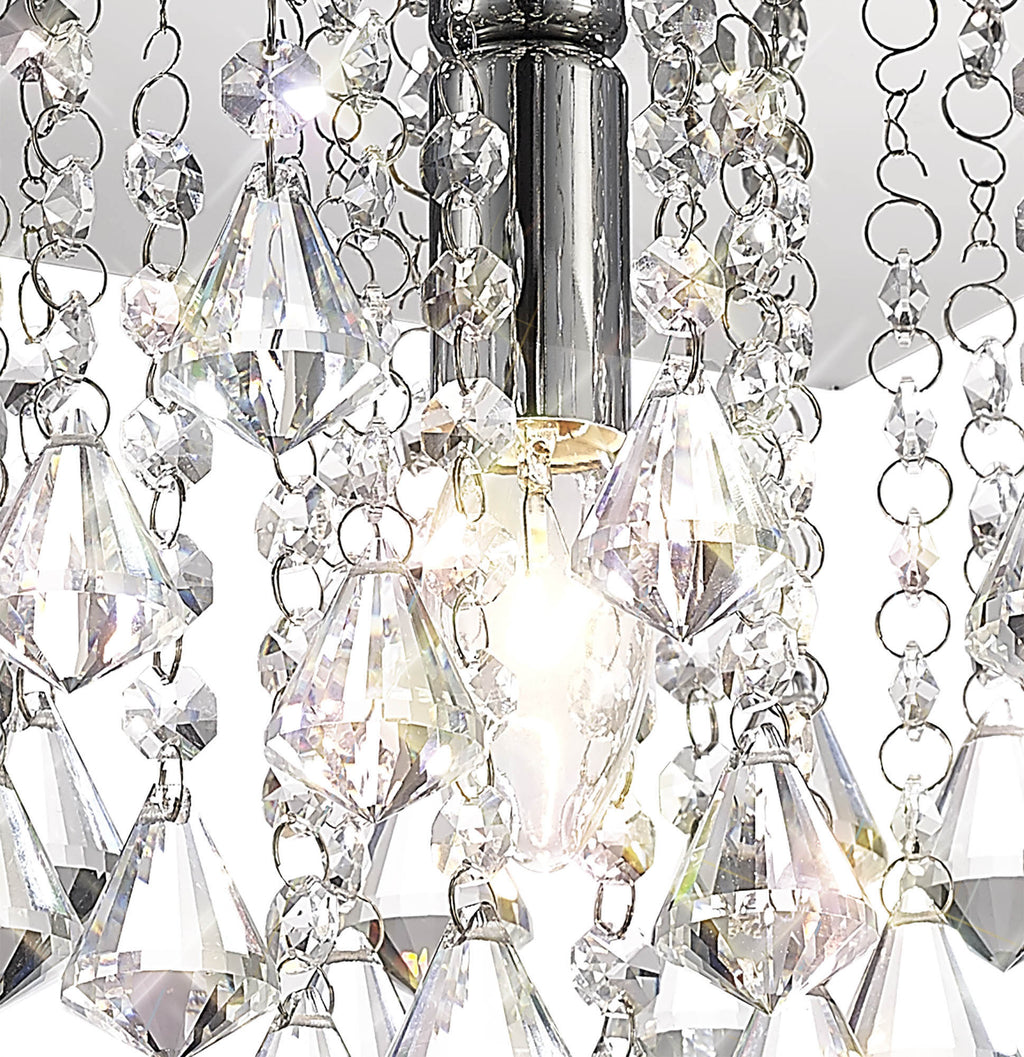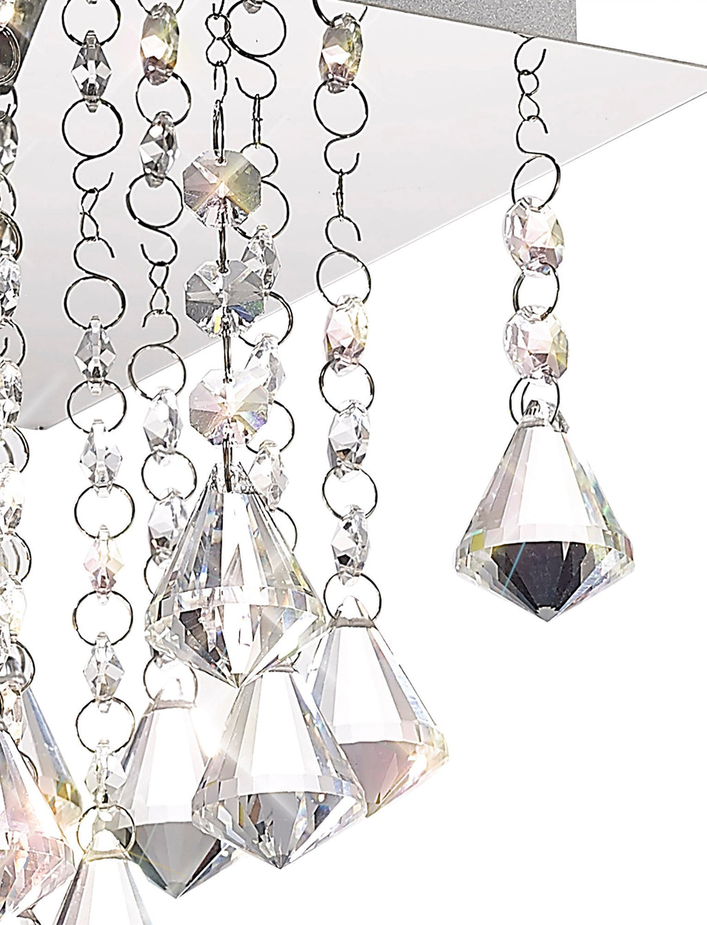 The round frame hangs strands of clear crystal buttons with a crystal sphere drop whilst the square frames swap the spheres for the more appopriate clear crystal prisms. Both designs are available in a 1, 4 and 5 light using E14 lampholders that take maximum 60W lamps.