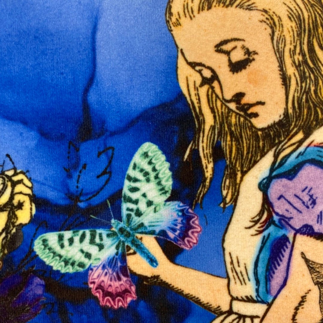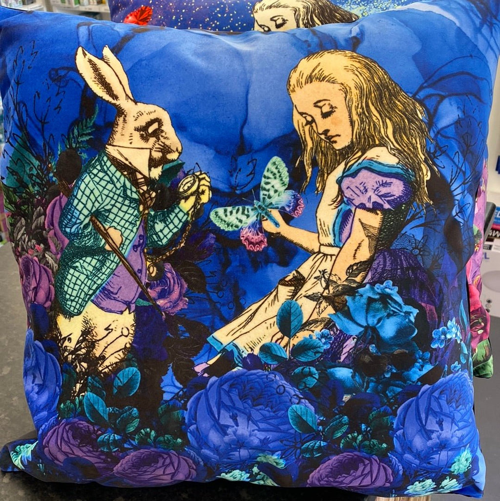 One side of the cushion is printed in a high quality image of Alice in wonderland and the white rabbit while the other is left in a plain black.