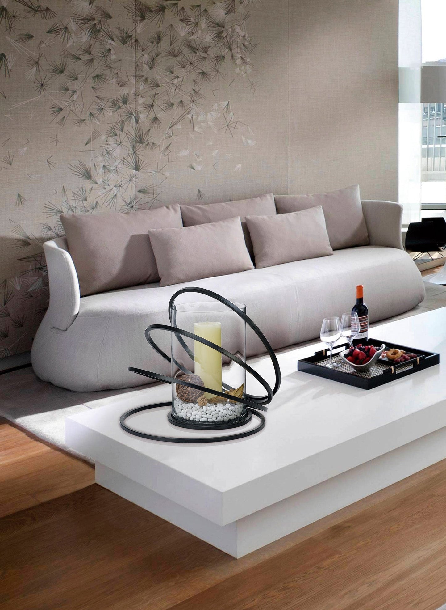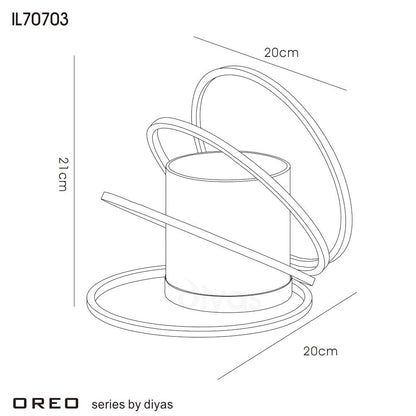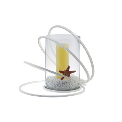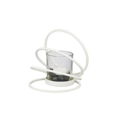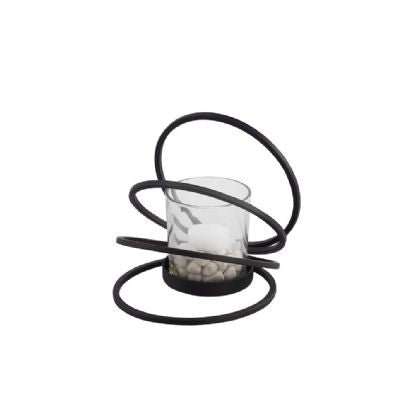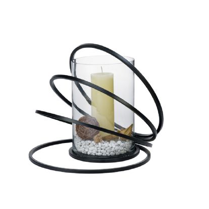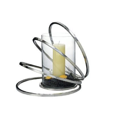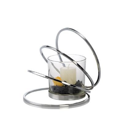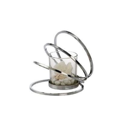 This stunning collection has a unique and ultra modern feel that forms a creative and stylish look. A series of metal rings welded at a single point create an optical illusion and make the rings seem to almost float around the central glass cylinder.
