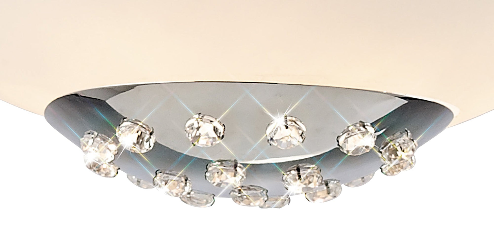 This unique and modern selection of semi flush and pendant ceiling fittings are available in Chrome or French Gold. Both finishes are extremely attractive and compliment the crystals, which add an elegance to the stunning range. The items are completed with a high quality white glass surround.