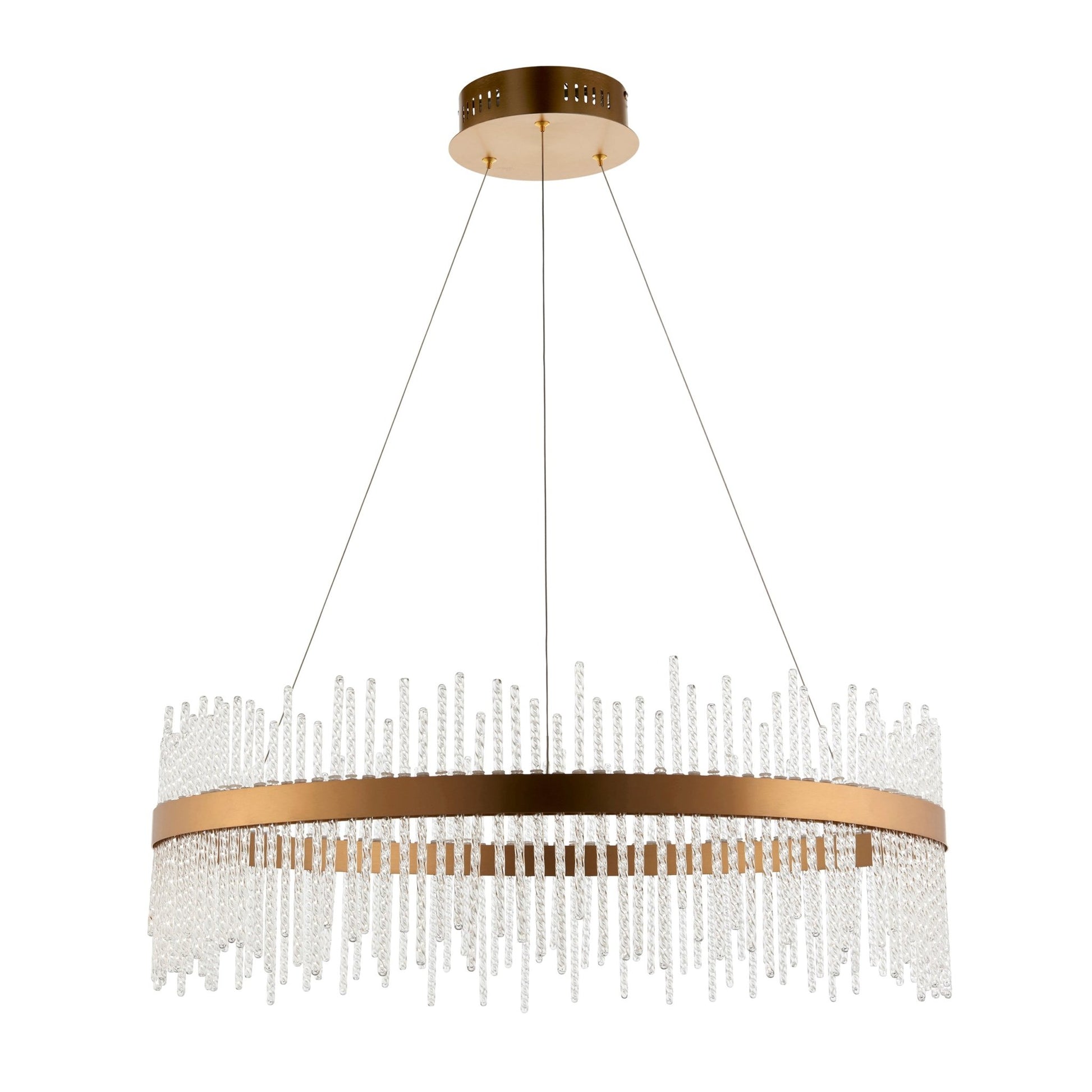 Its twisted glass rods house integrated LED lights that give the effect of the glass glowing within the gold brushed framework.