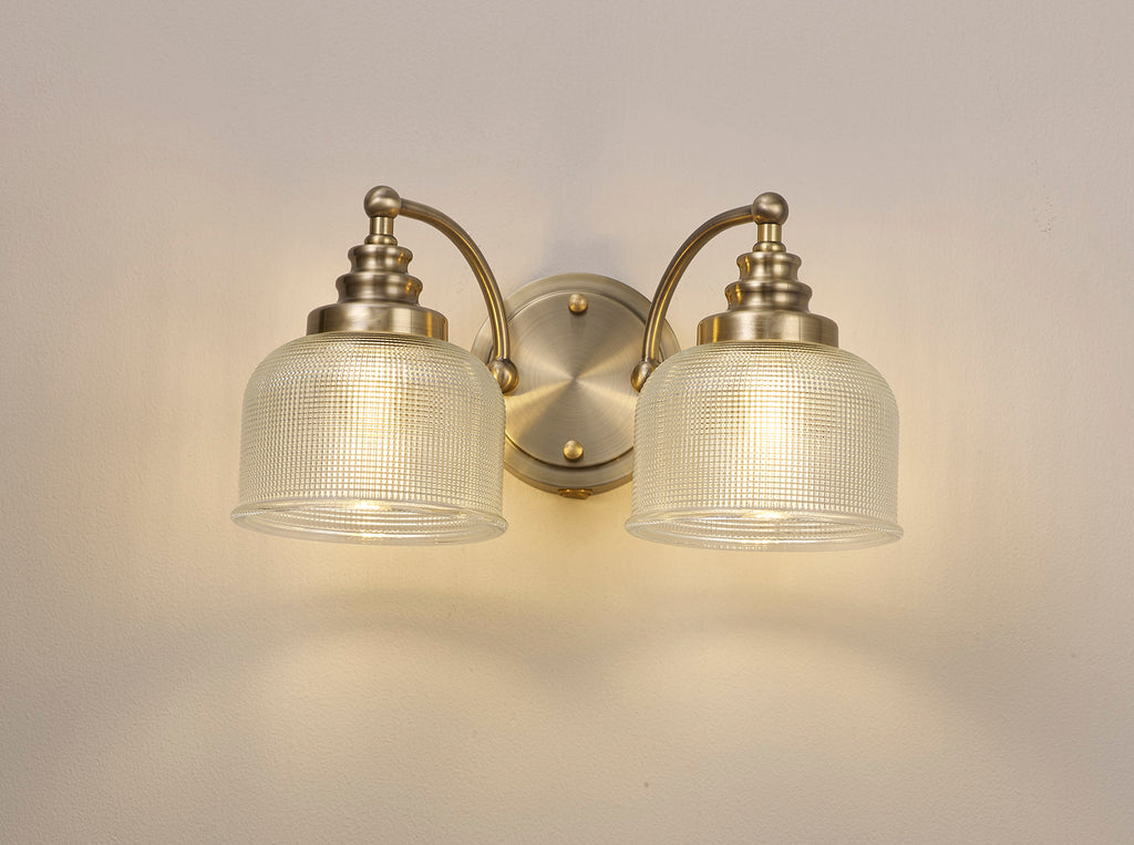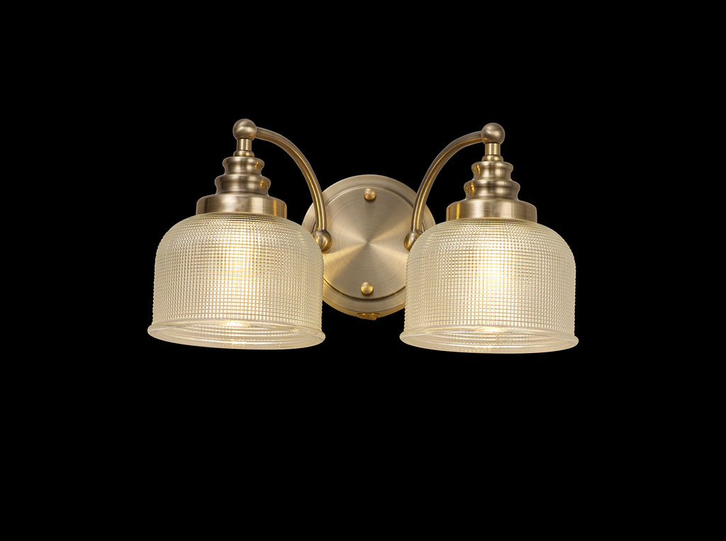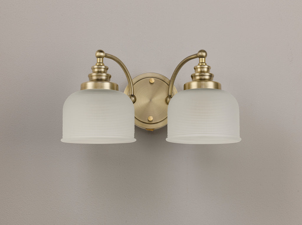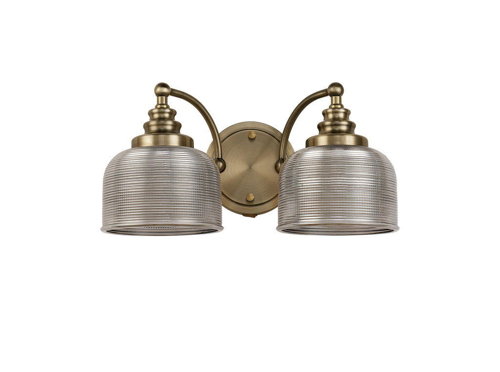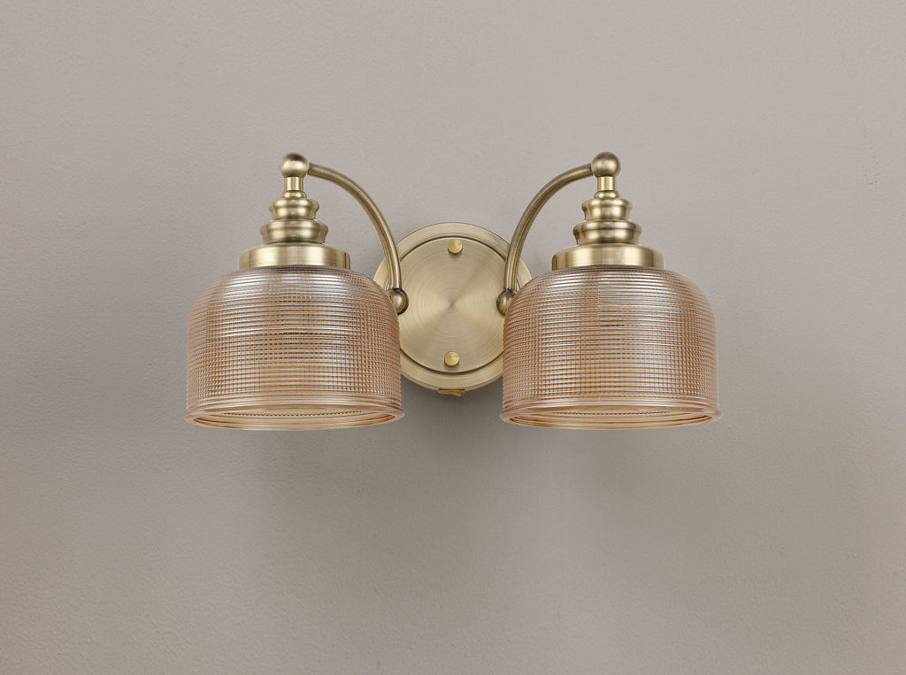 Antique Brass Sledmere Double Wall Light, Switched, 2 x E27, Glass Shade