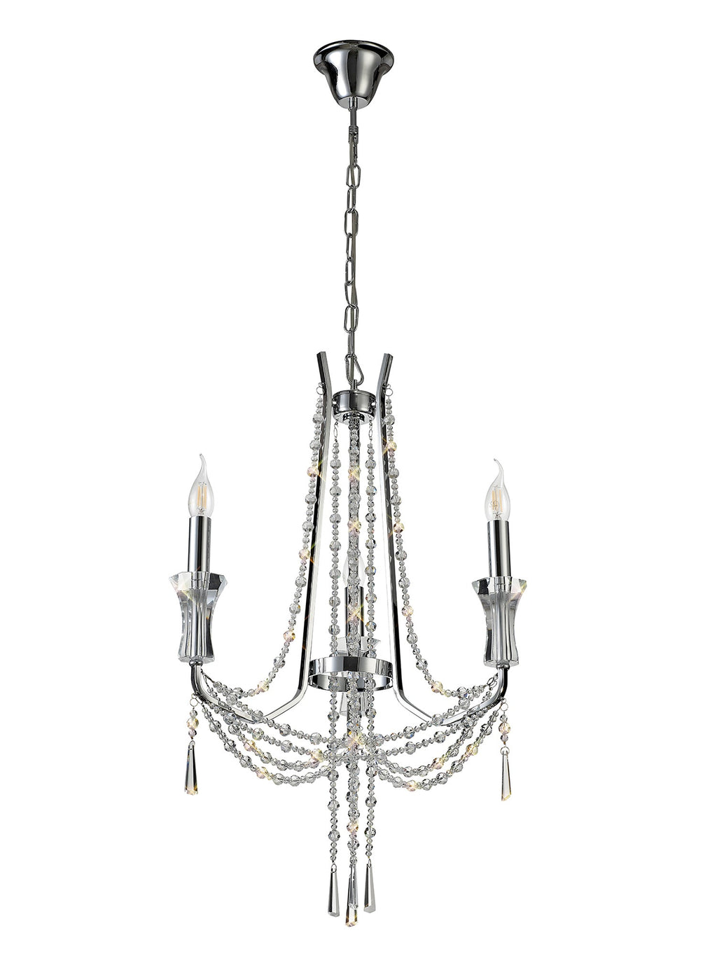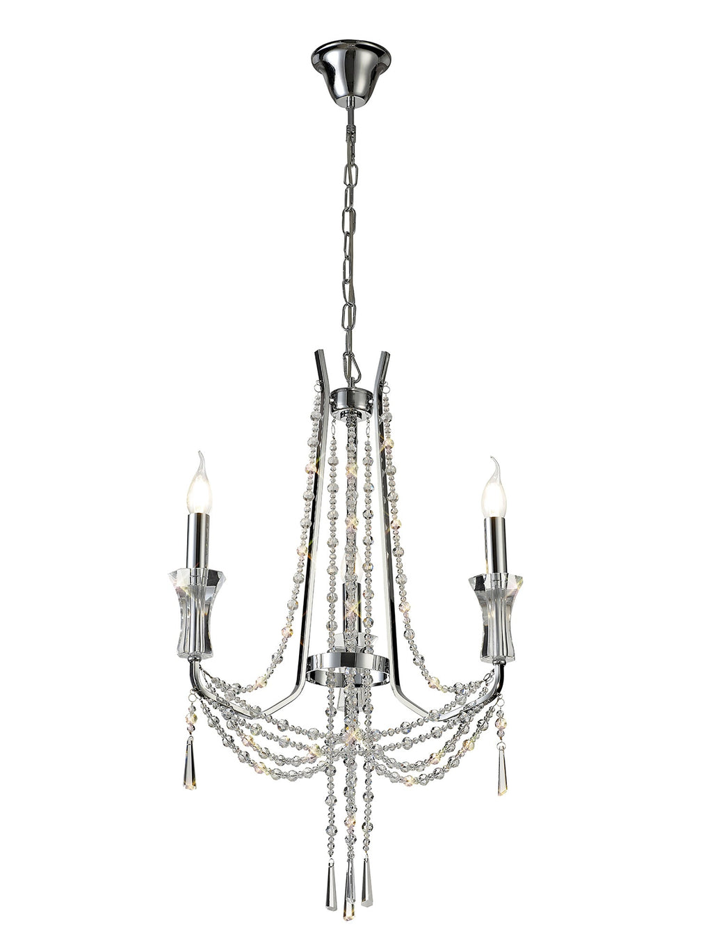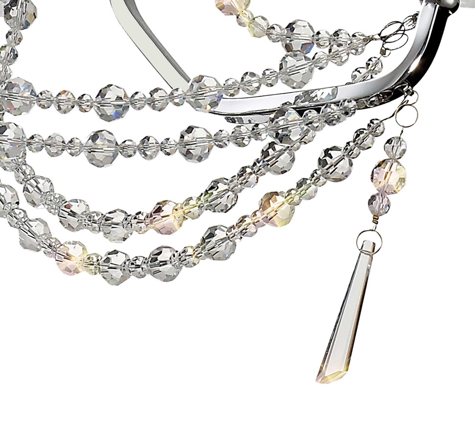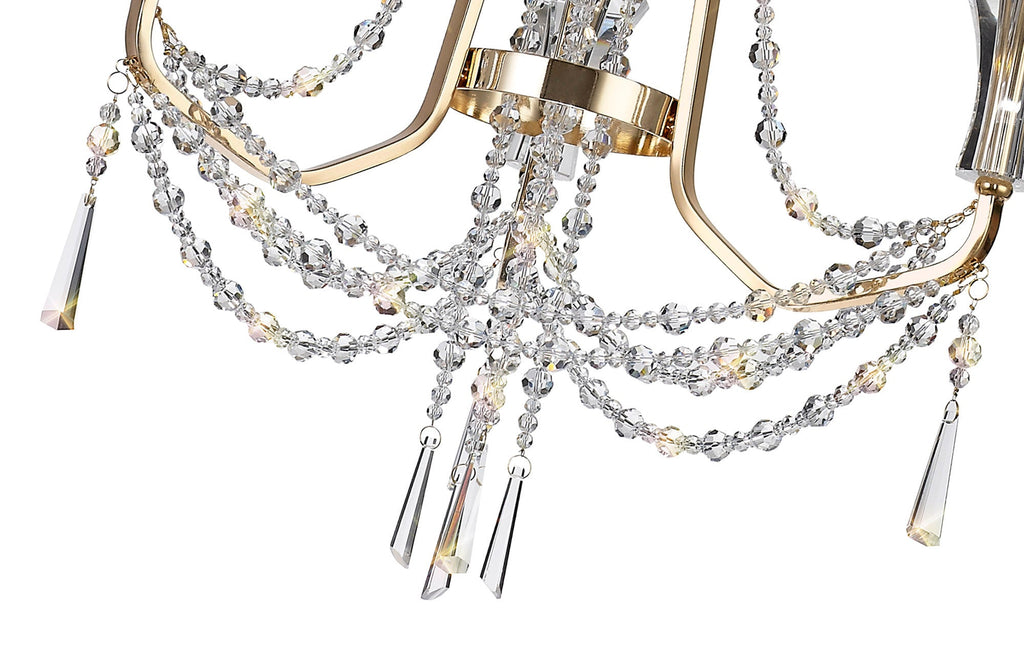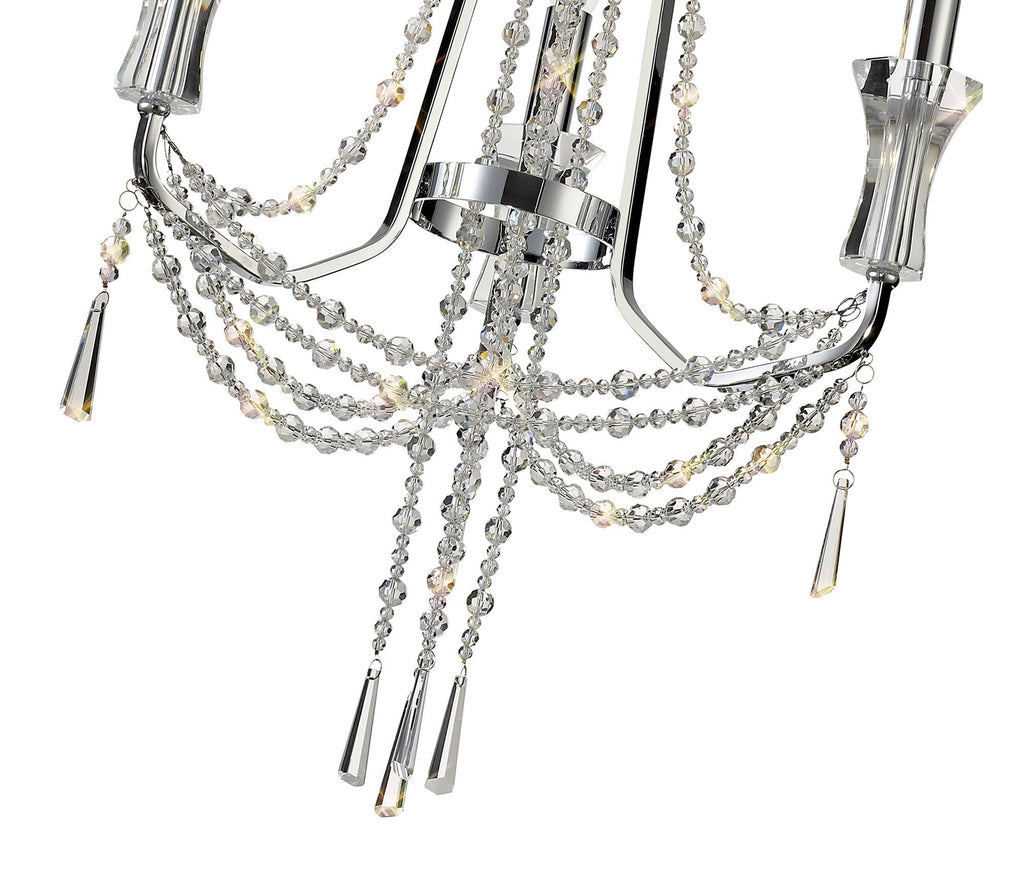 This collection of stunning crystal chandeliers and wall lamps uses a minimal amount of framework ensuring the dazzling crystal components are the main feature. Each arm is adorned from the top of the centre column down to the lampholder with high quality clear crystal pieces which alternate in size producing a visually enticing effect. Armand's distinctive imperial presence is even more prominent with additional crystal strands draped from arm to arm meeting below the substantial crystal glass piece which hosts the E14 lampholders. Available in three colour finishes to complement a modern, traditional or contemporary room setting, Armand is a high-class, sophisticated design.