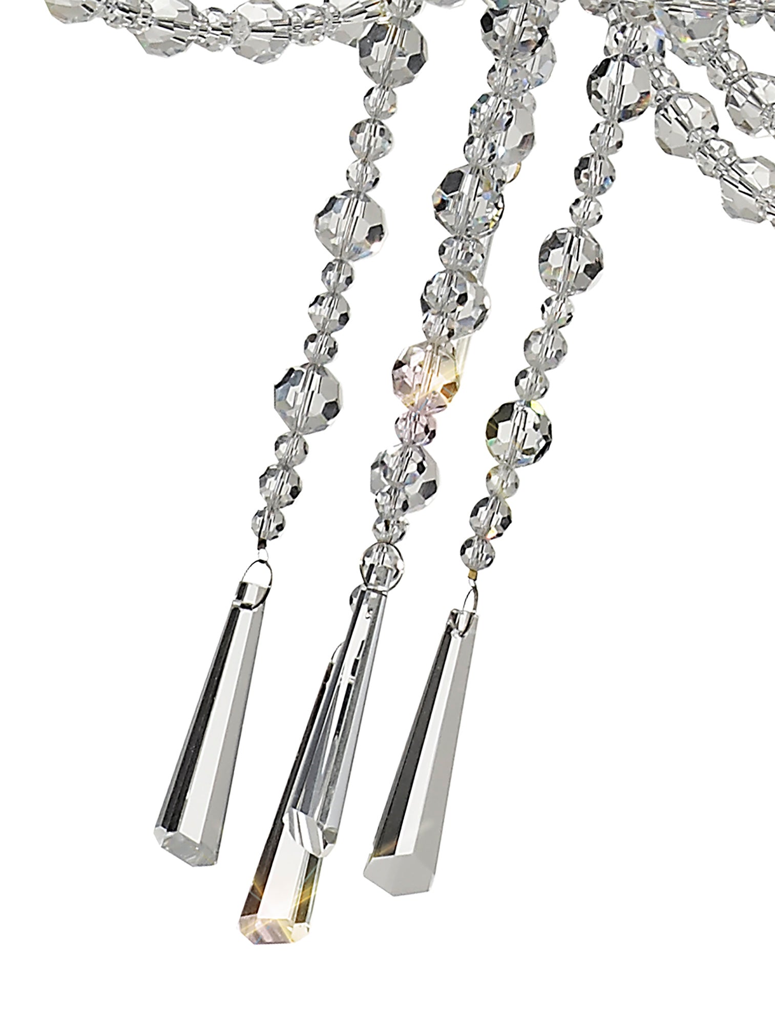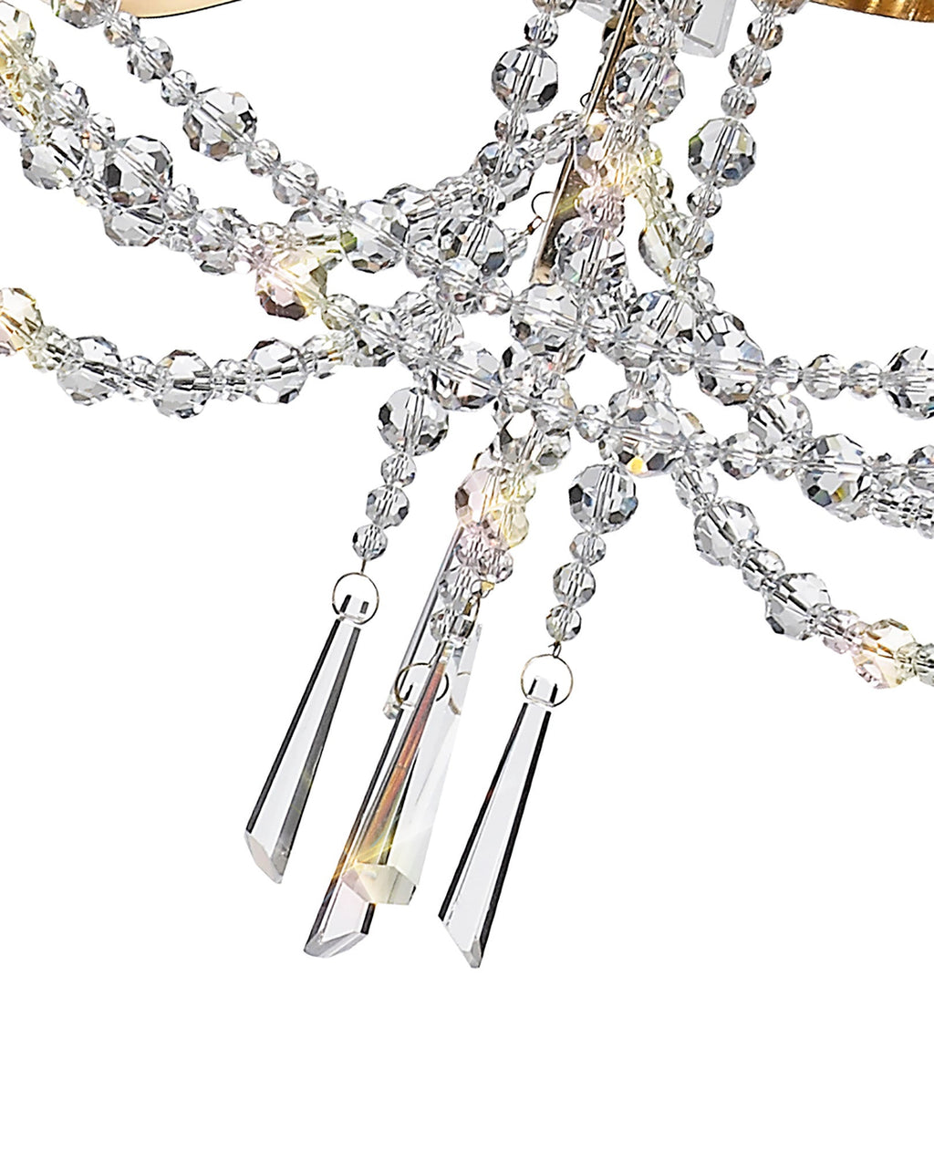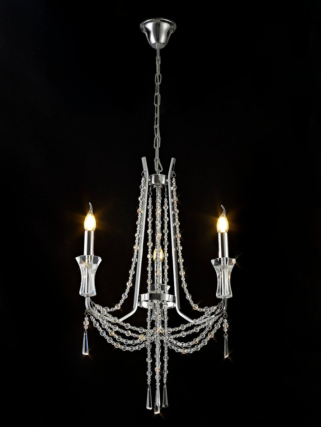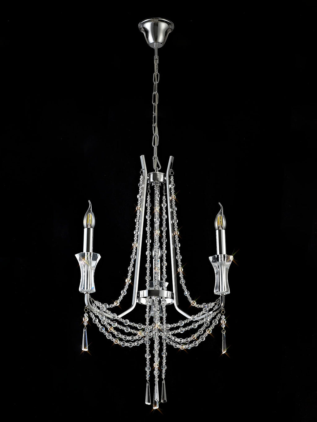 This collection of stunning crystal chandeliers and wall lamps uses a minimal amount of framework ensuring the dazzling crystal components are the main feature. Each arm is adorned from the top of the centre column down to the lampholder with high quality clear crystal pieces which alternate in size producing a visually enticing effect. Armand's distinctive imperial presence is even more prominent with additional crystal strands draped from arm to arm meeting below the substantial crystal glass piece which hosts the E14 lampholders. Available in three colour finishes to complement a modern, traditional or contemporary room setting, Armand is a high-class, sophisticated design.