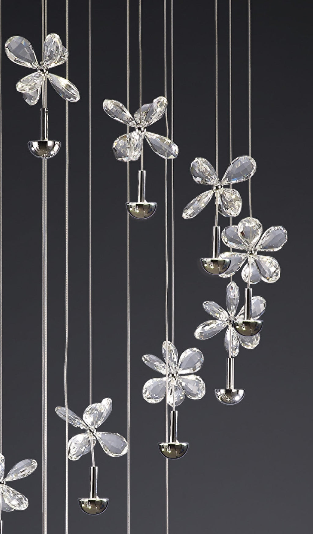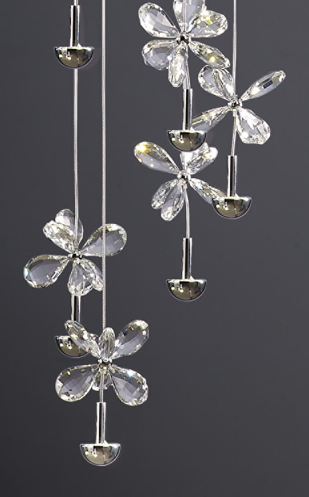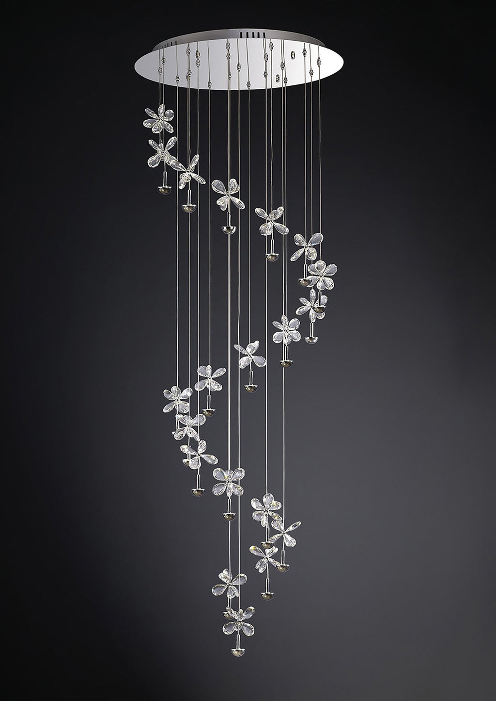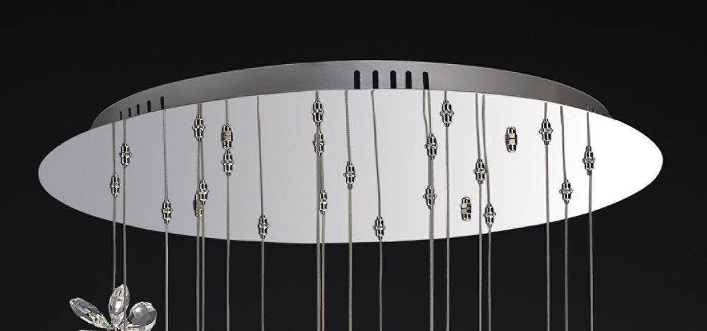 A stunning design has been created using the latest LED technology resulting in this magnificent collection.  Contra to traditional methods of illumination, up-light projection has been used to enhance the illumination of the unique and beautiful crystal petals, which creates an amazing effect throughout the design. The masterpiece in the collection is the 28 light pendant which is simply stunning.  There are also spiral versions which would be suited for staircase locations.  The in-direct light simply leaves the observer bewildered as to how the dazzling effect is created.