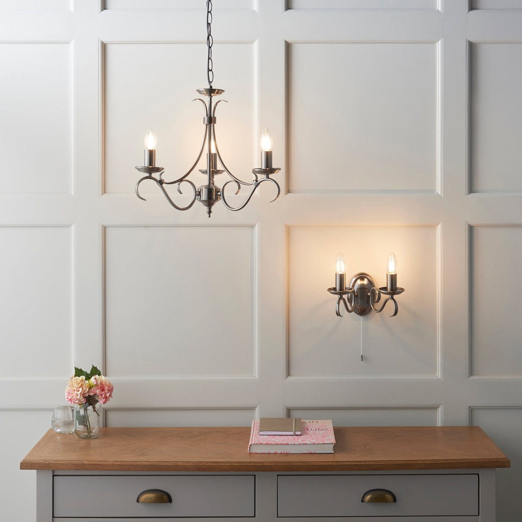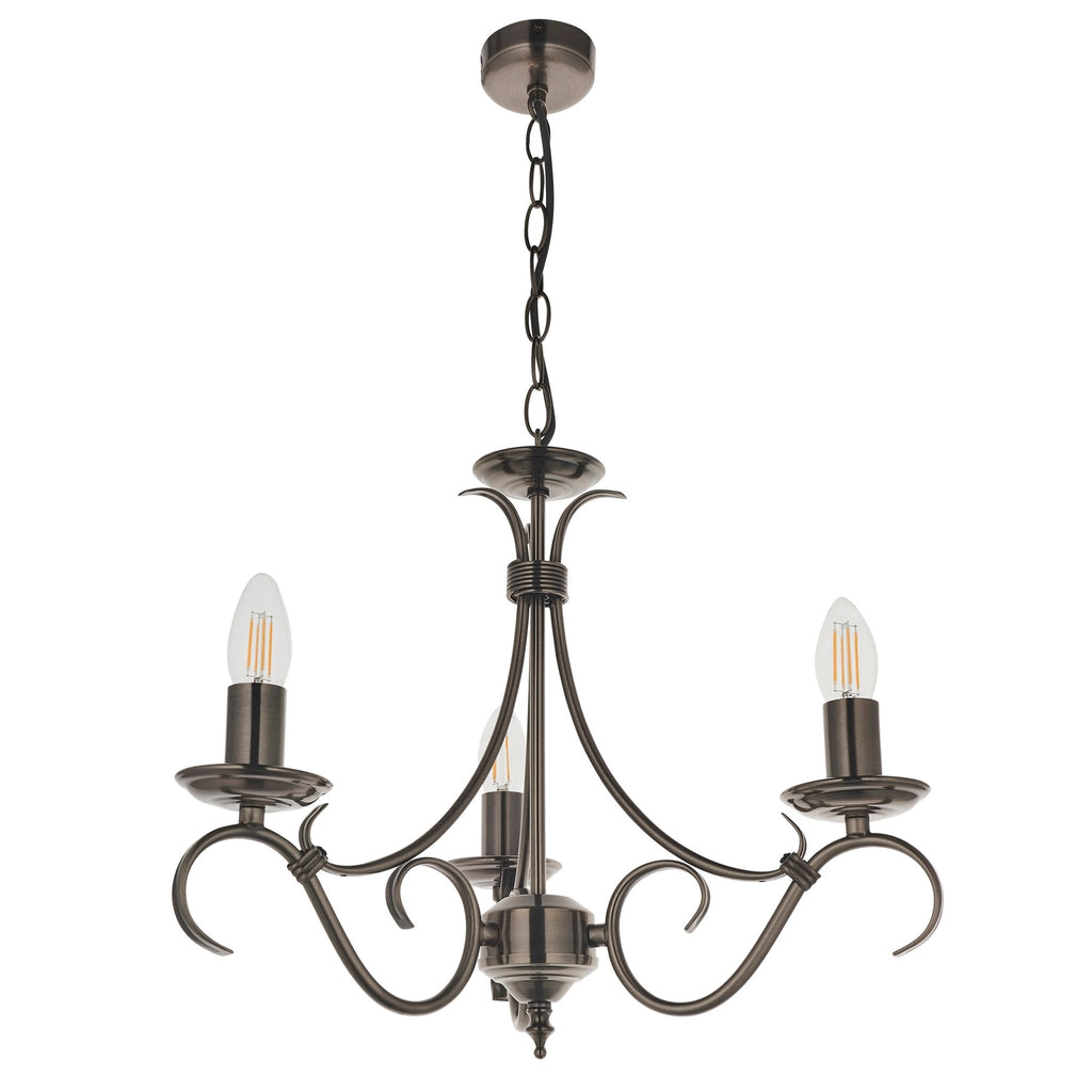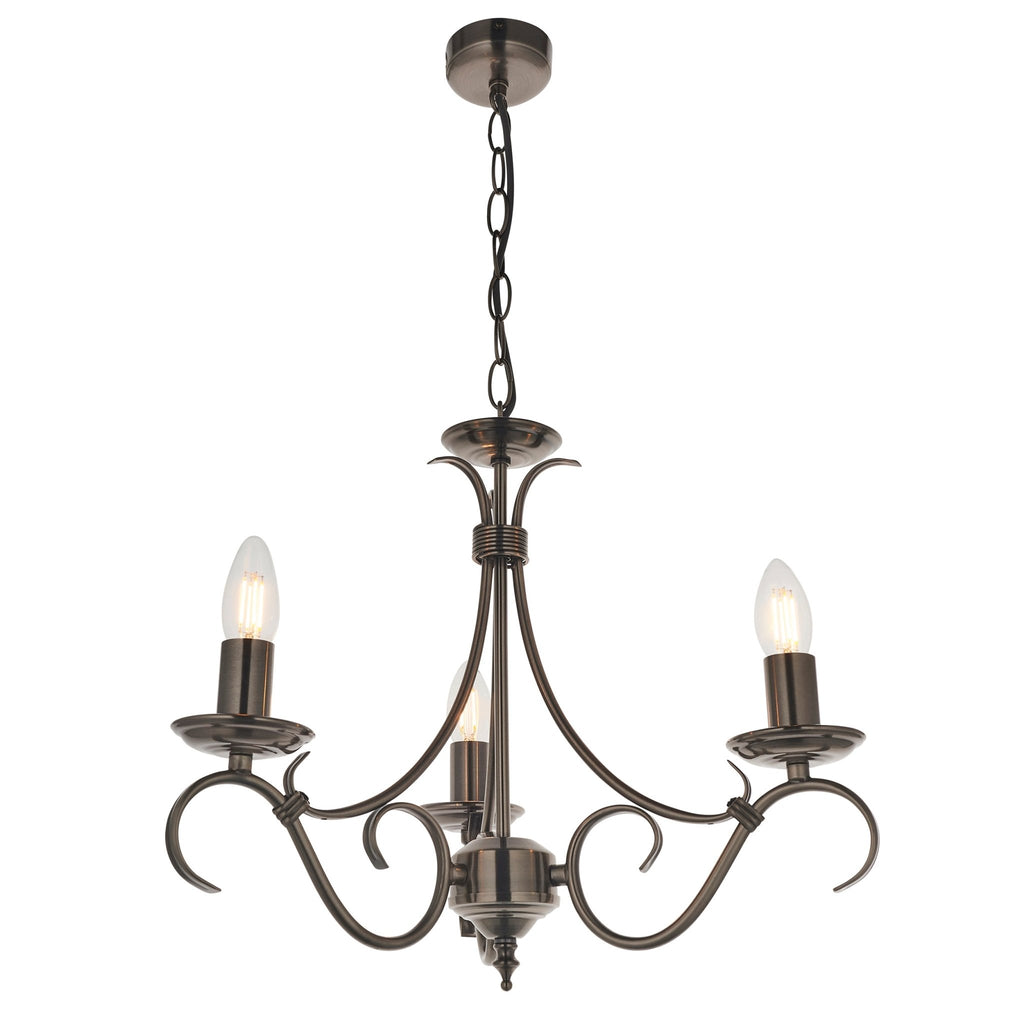 A 3 light ceiling fitting with scrolled arms in antique brass or silver effect finish. suitable for use with LED lamps, height adjustable and dimmable. Matching items available