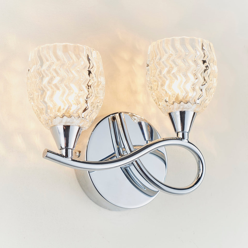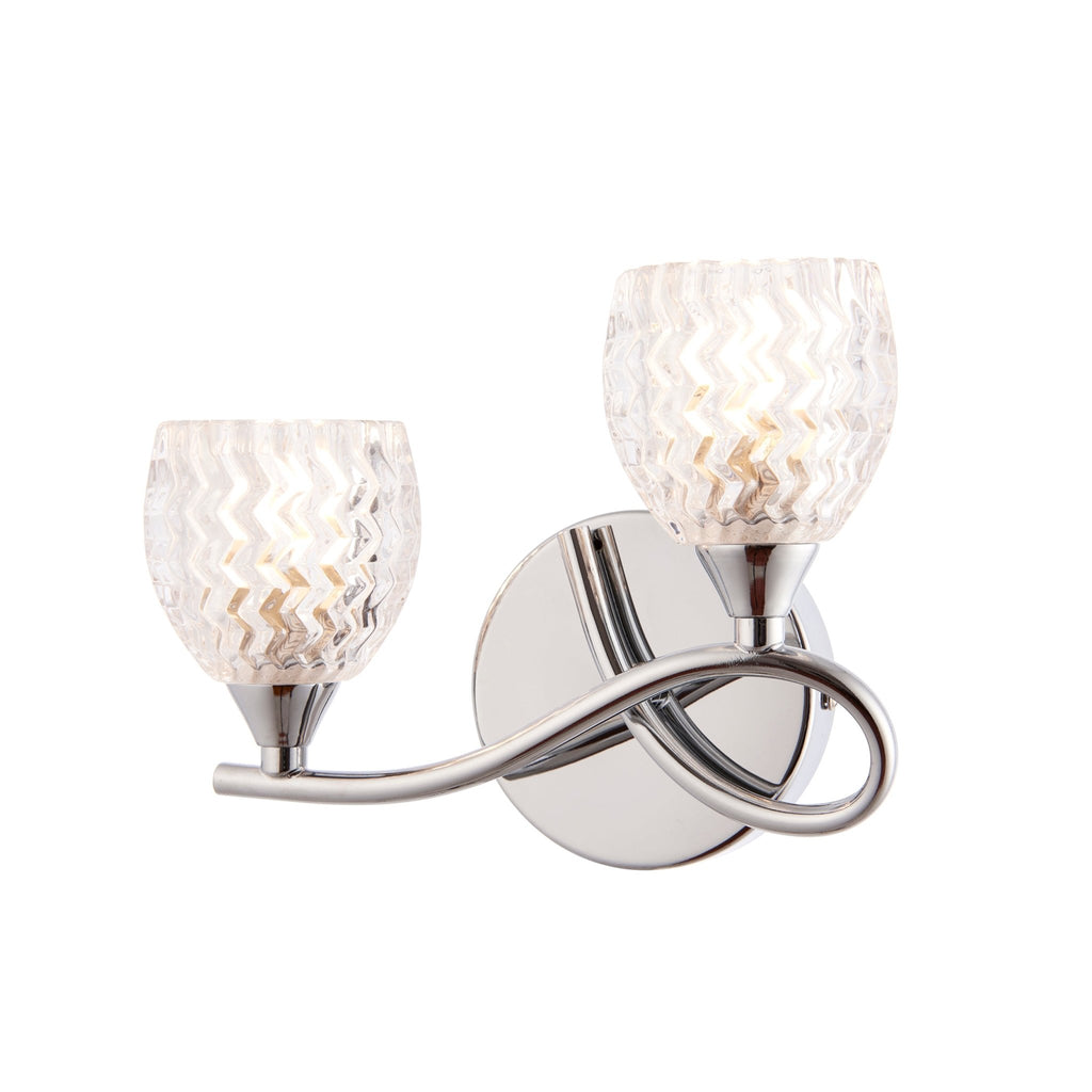 A twin wall light with curved metal arms sweeping to the left with cut glass shades. suitable for use with LED lamps and dimmable. Matching items and other colour options available