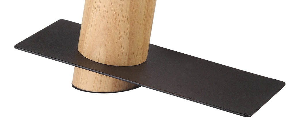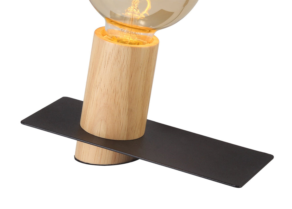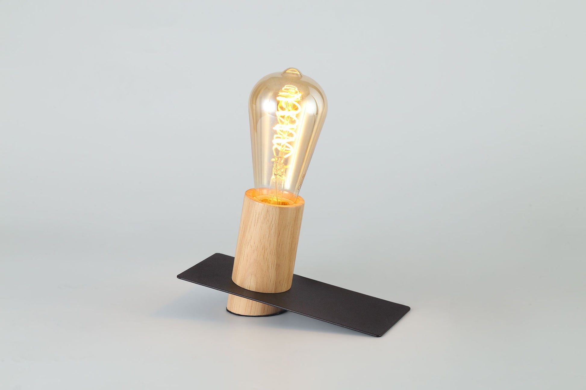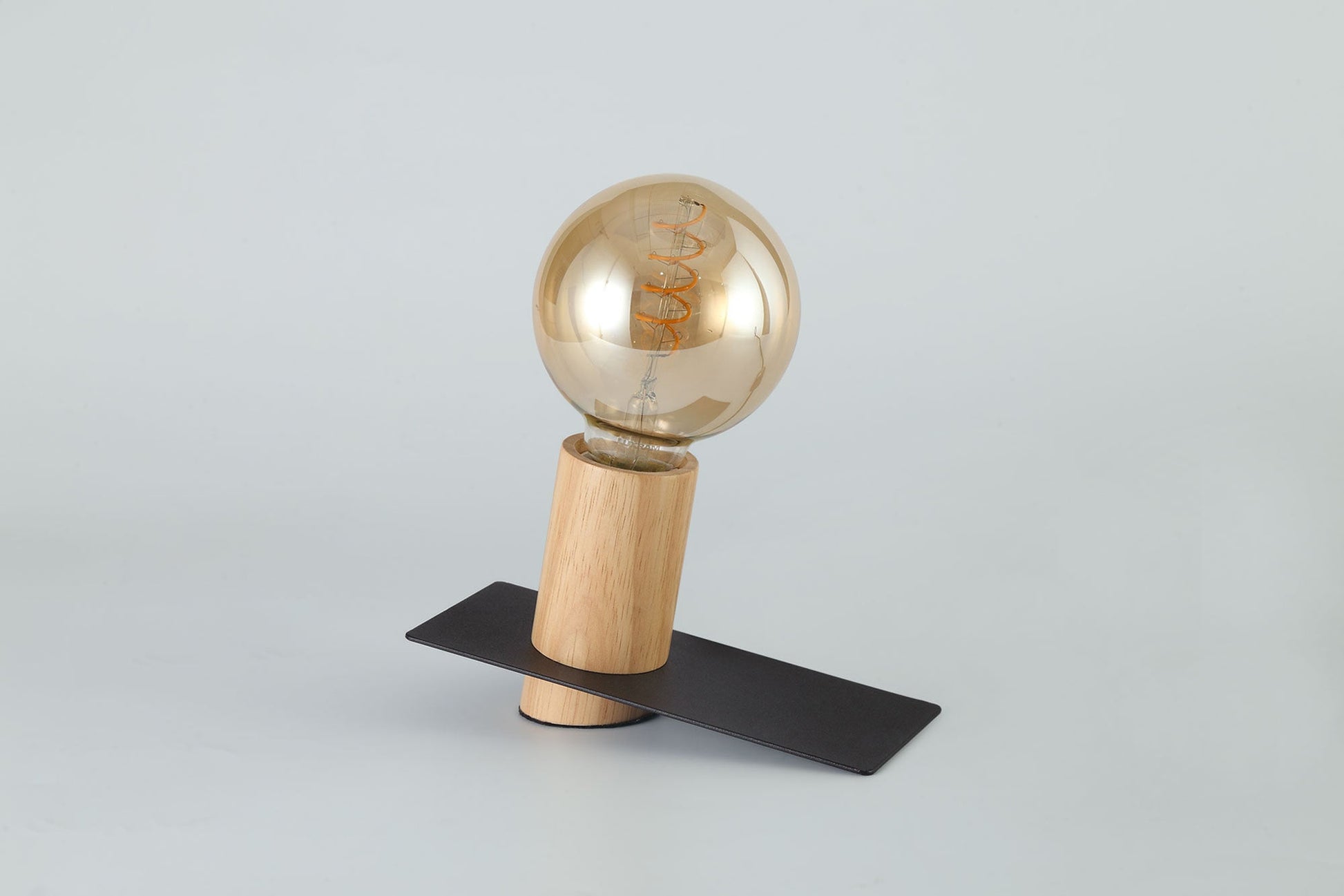 The angled wooden cylindrical base which holds the E27 lampholder is sliced by a black metal panel which follows the angle and ends parallel to the base to support its balance in a creatively stylish manner.
