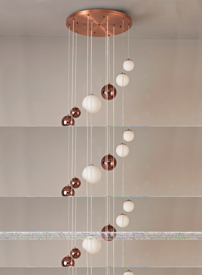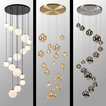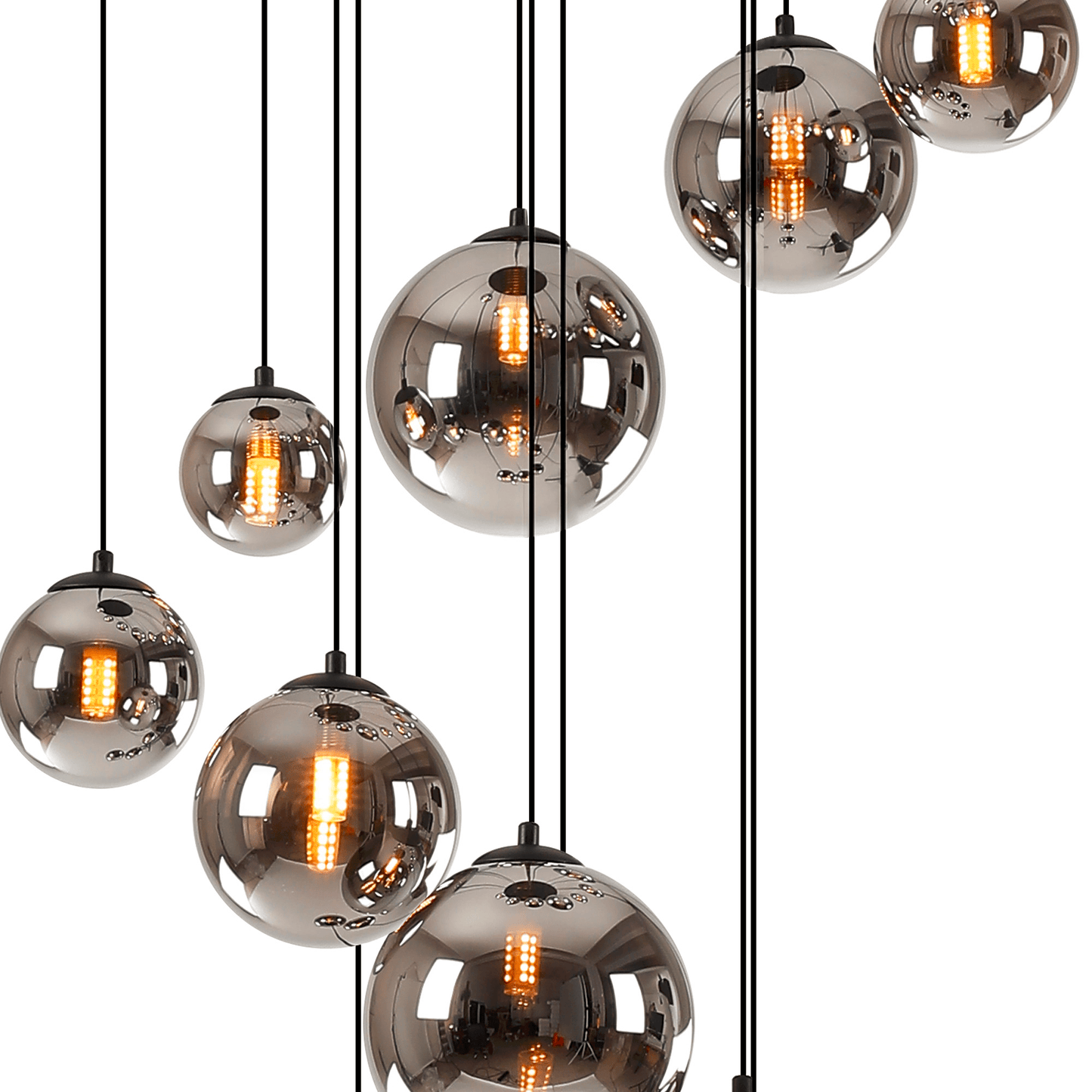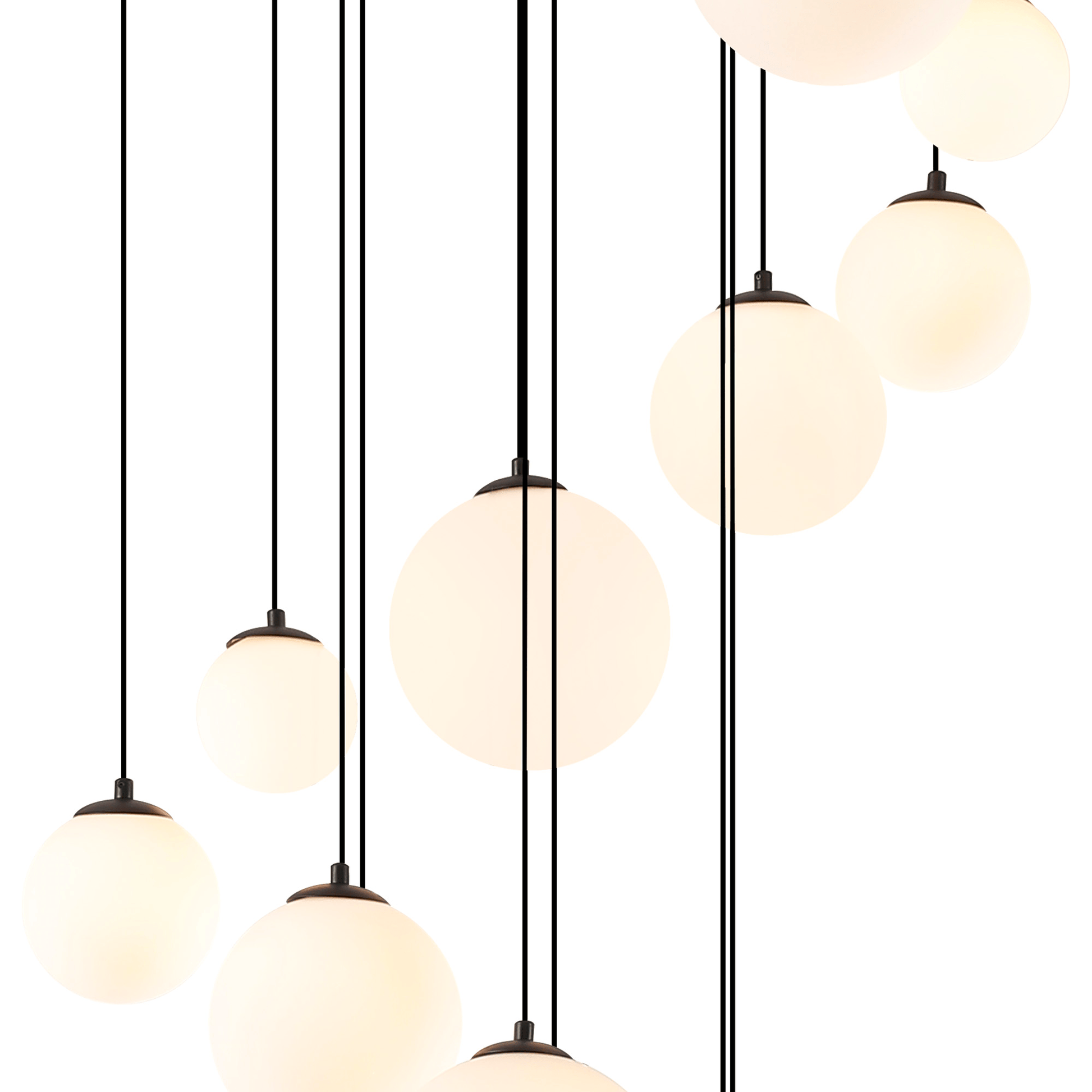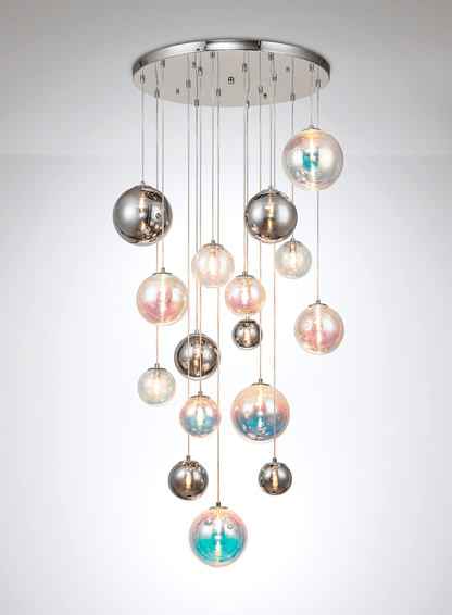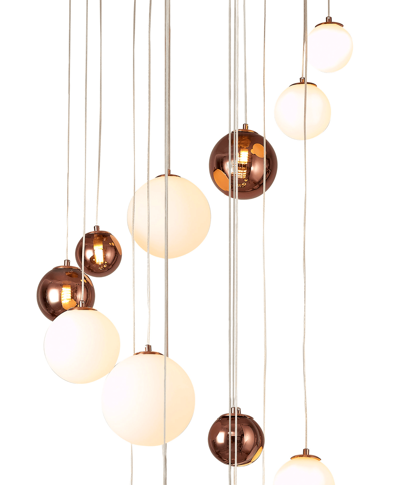 Its glass bubbles of varying shades each encompass their own changeable bulb and are mounted on a metal fitting