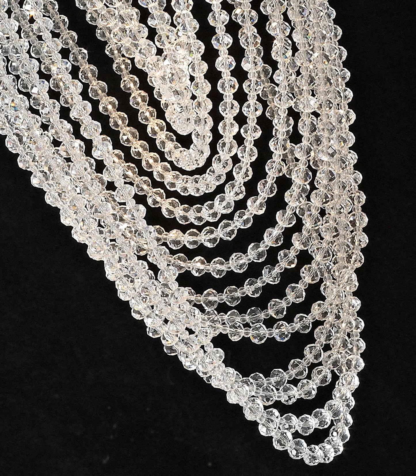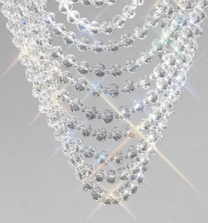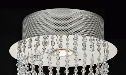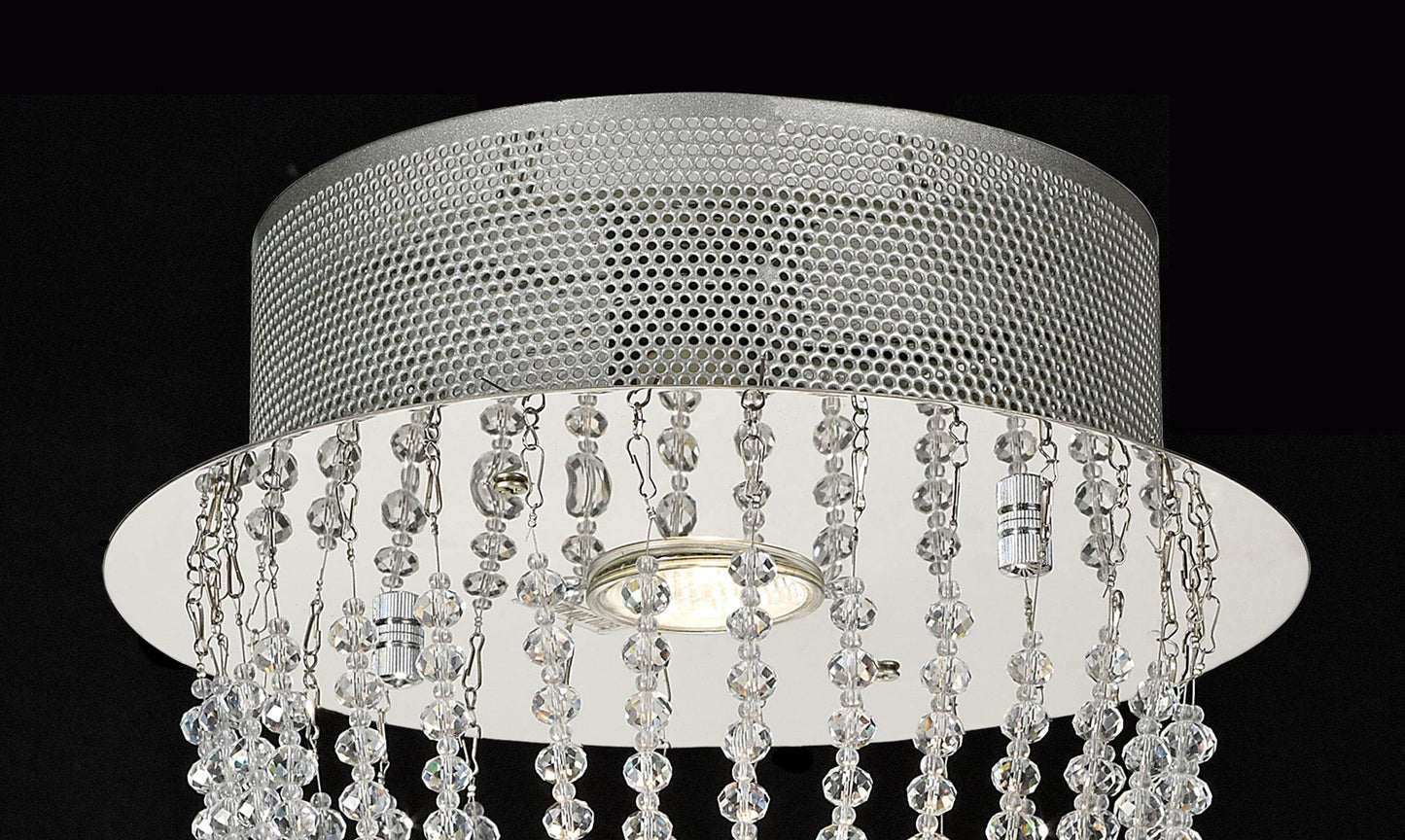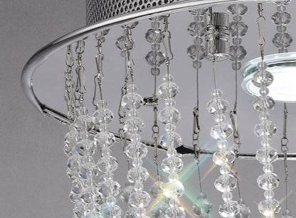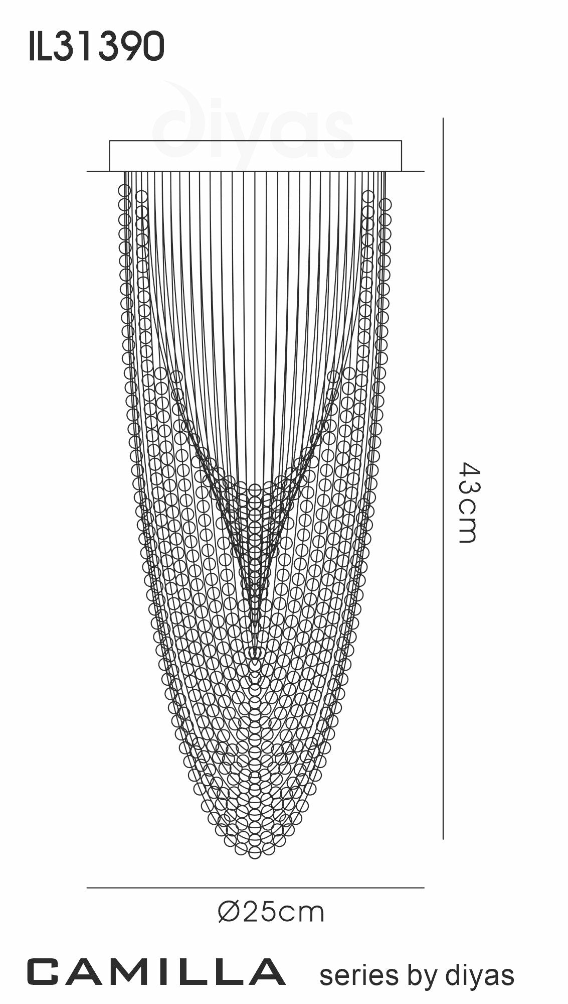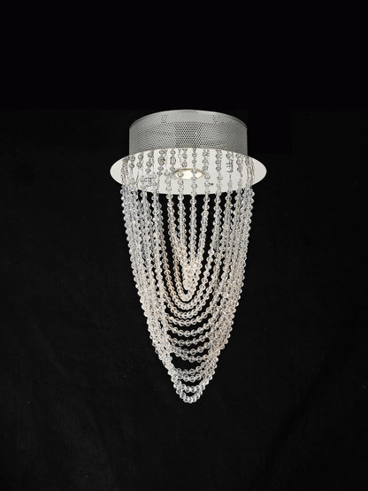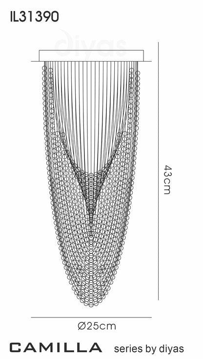 This range combines contrasting Asfour crystal components with Polished Chrome ceiling plates to create a stunning thought provoking design. Crystal beaded strands are sequenced using minute beads and more substantially sized ones producing elaborate patterns. The variably sized strands are then hooked to the frame from both ends to create a waved tunnel illusion. 40mm crystal balls are suspended within the wave of crystal to add even more impact. The 1 light Camilla fitting offers a more simplistic approach to this fascinating design.