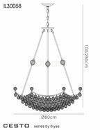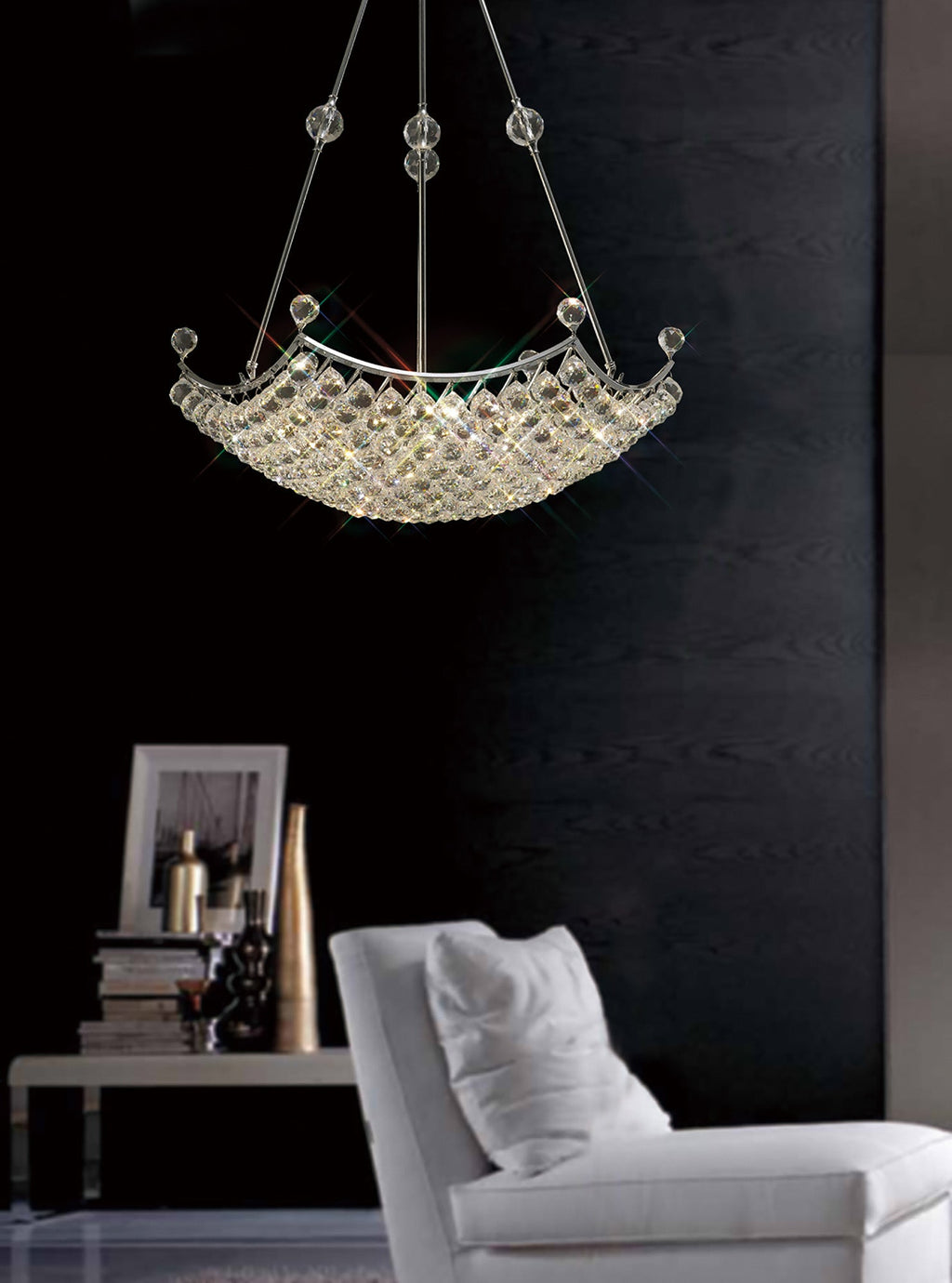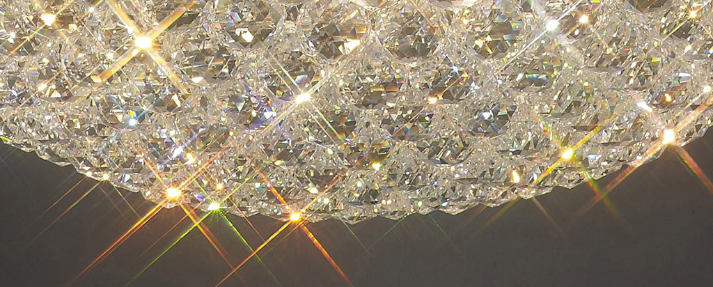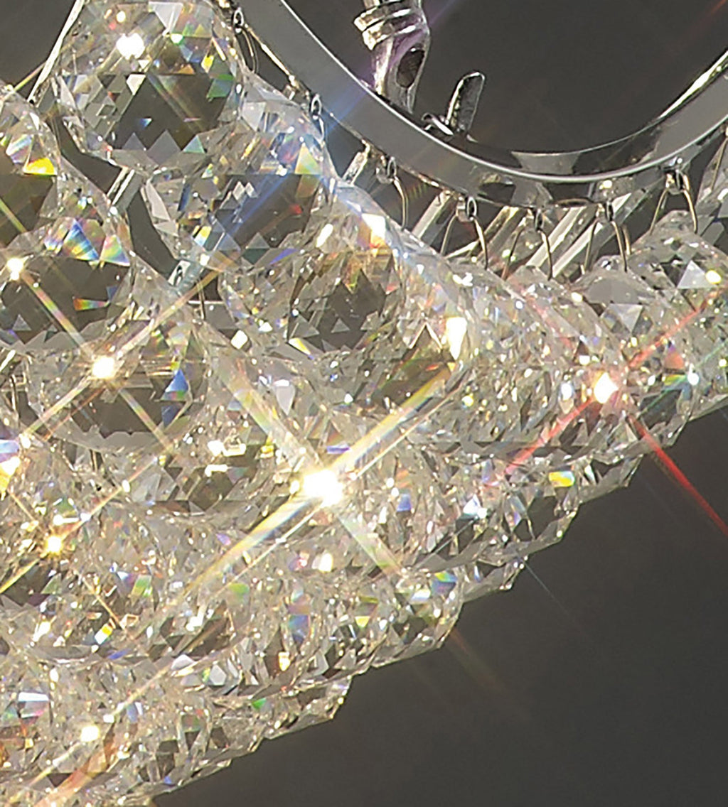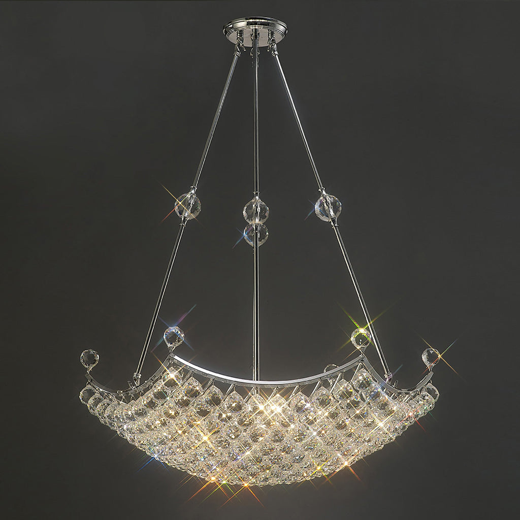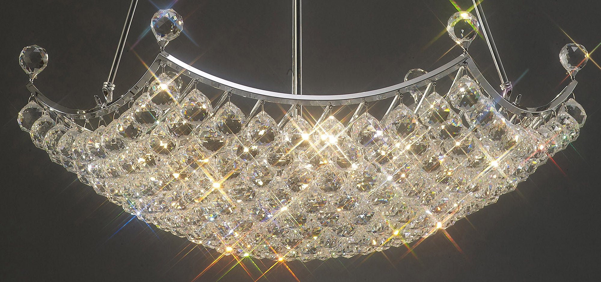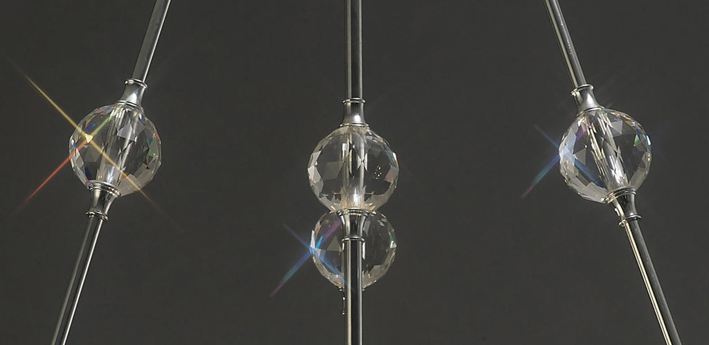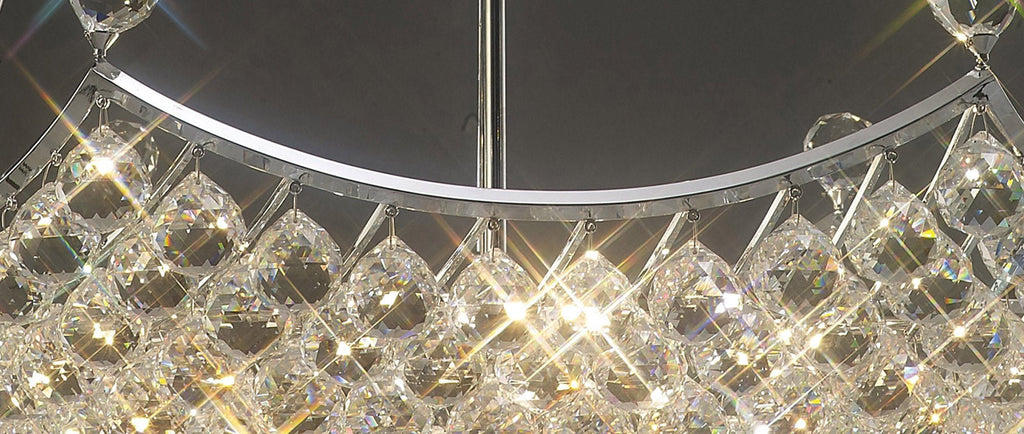An extravagant stunning Polished Chrome fitting filled with an abundance of 40mm Asfour crystal spheres. The larger fitting is supplied with a chain suspension while the smaller fixture is semi flush. The basket of crystal spheres has been designed so that every single crystal is making contact in order to create a continuous sheet effect. The upstanding crystal spheres and crystal ball in the suspension rods ensure no detail has been missed to create this magnificent range.