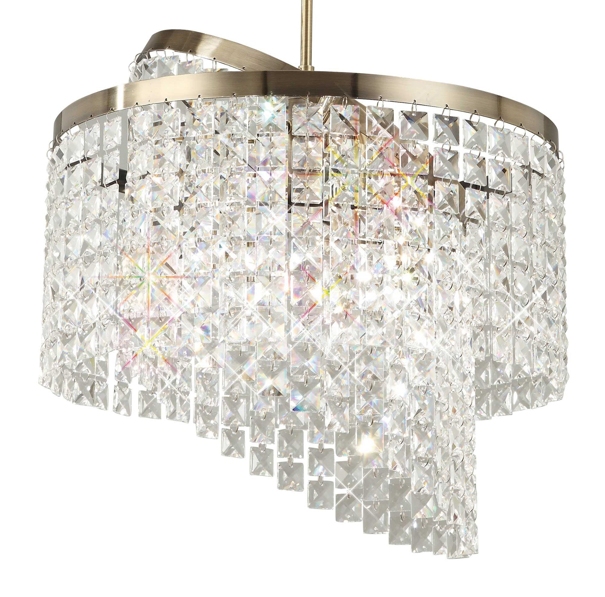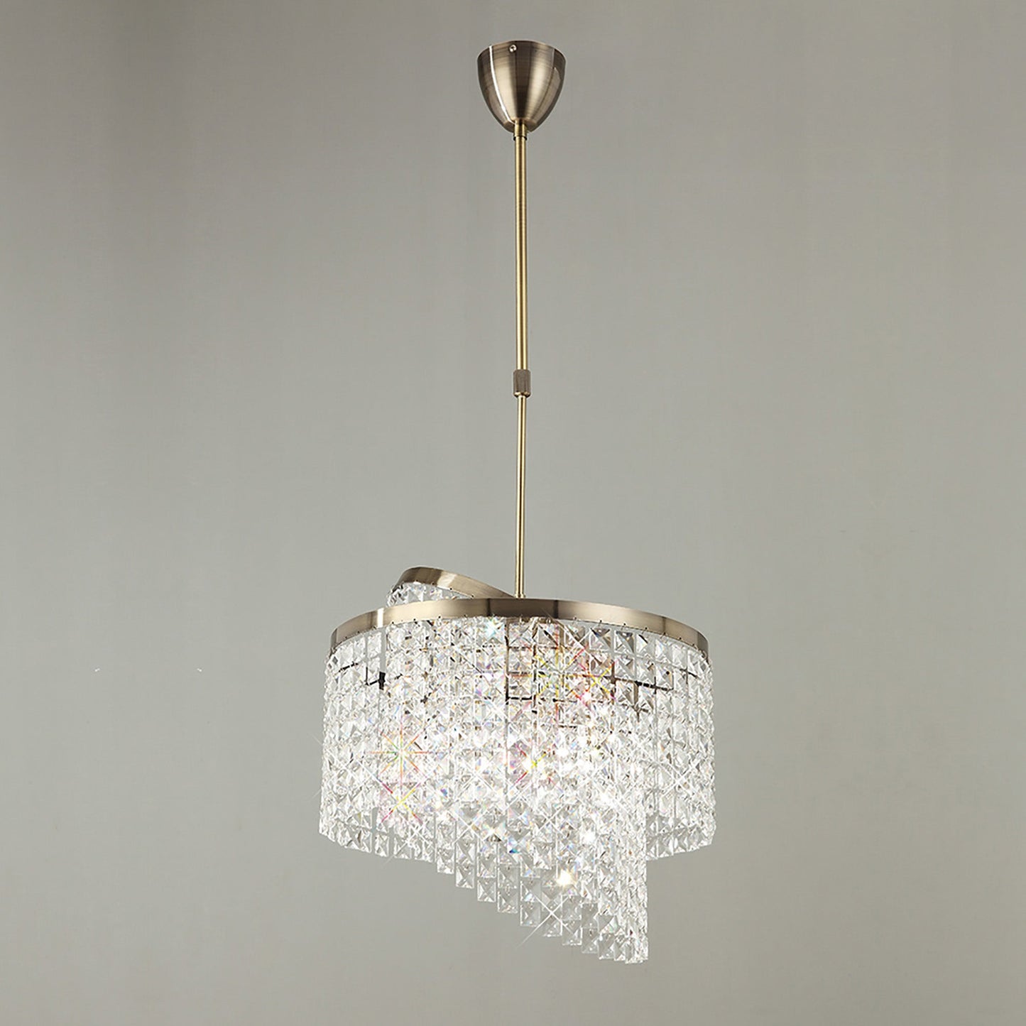 A fascinating twin ring Antique Brass collection fully loaded with strands of stunning Asfour crystal squares. As each ring can be pivoted independently, different designs can be created from the one item. The inner strings of crystal are longer in length than the outer ring thus creating a more unique family of light fittings. Telescopic suspensions were selected to give the items a more define and contemporary appearance.