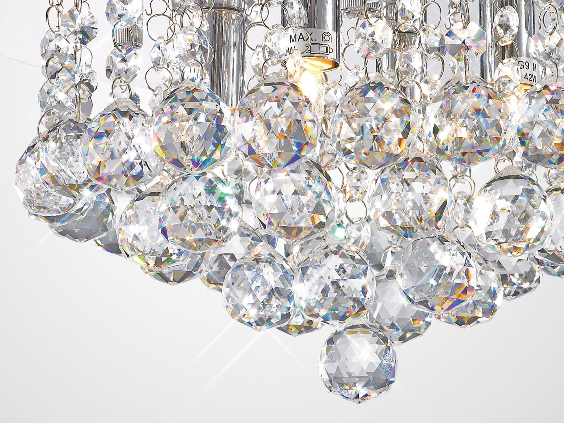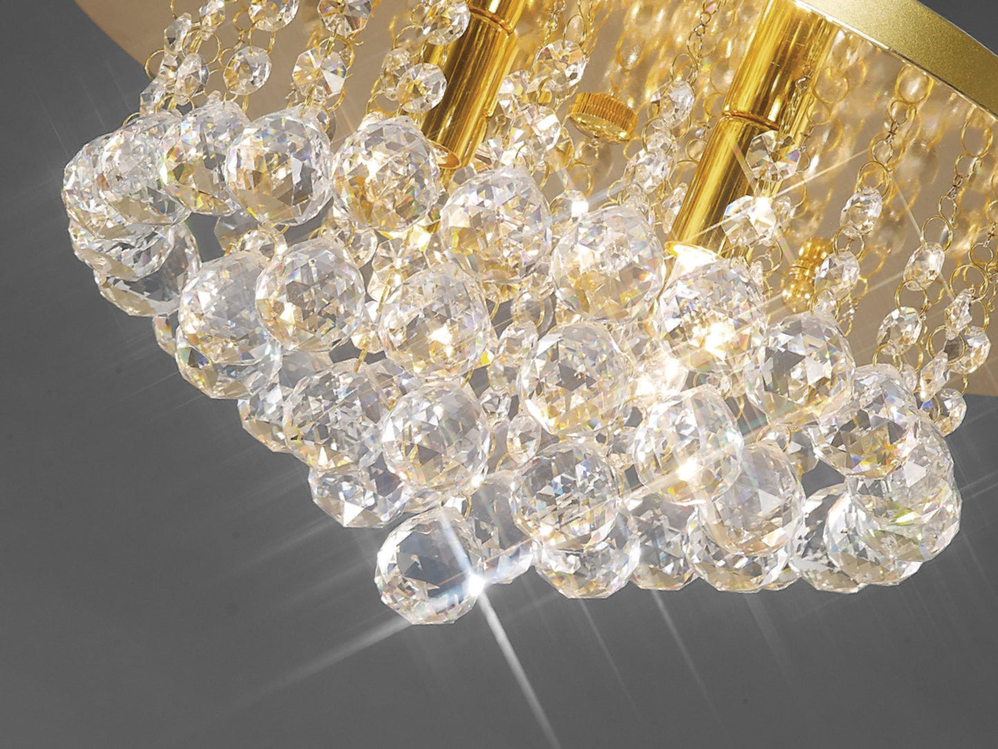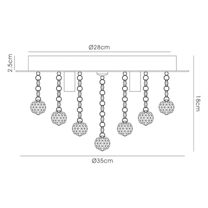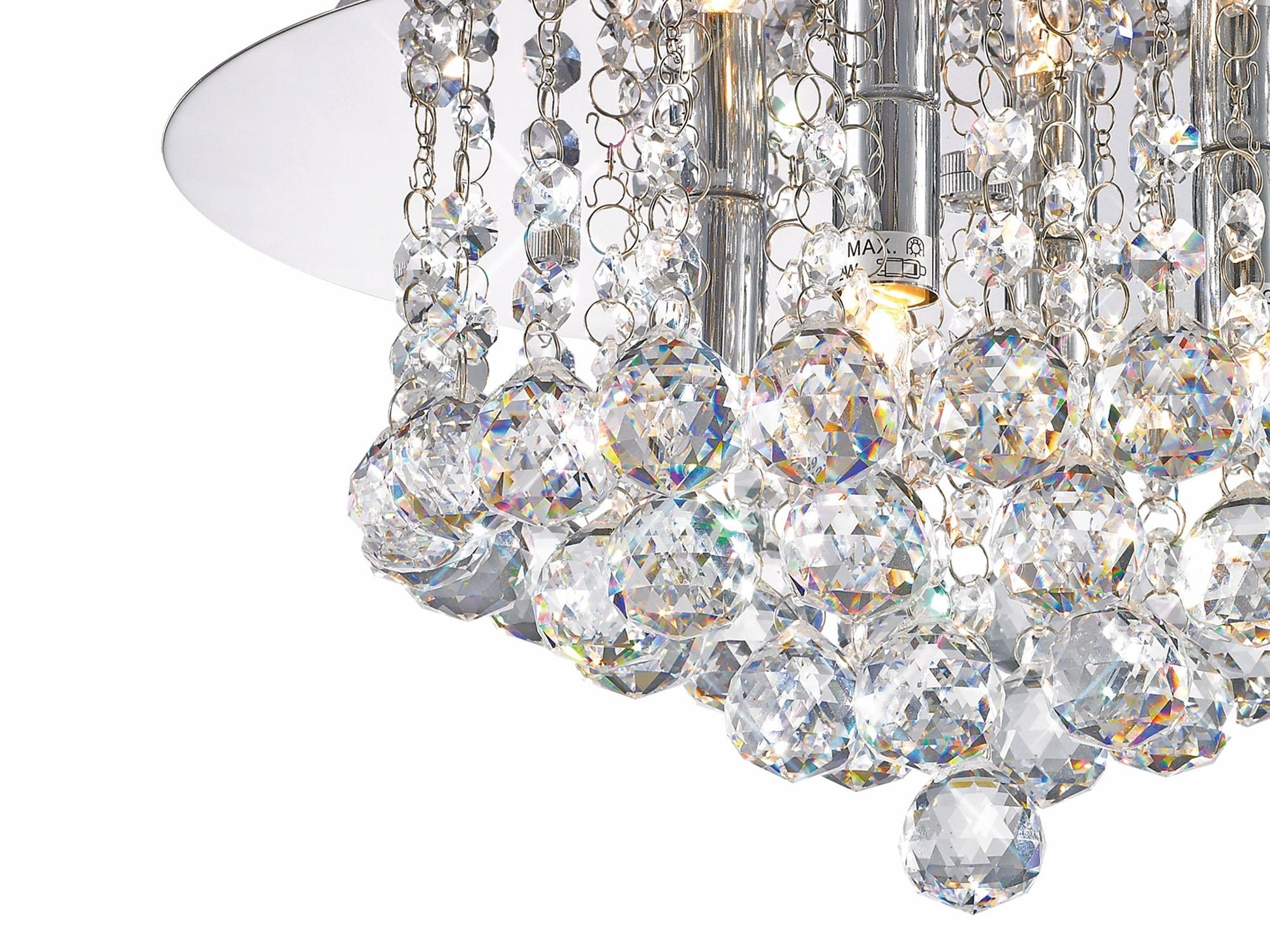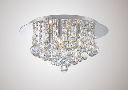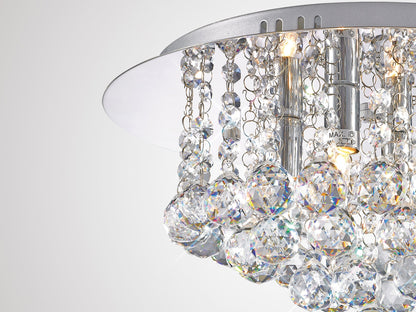 The Dahlia range is a stylish collection of four round flush ceiling lights decorated with rings of clear crystal strands and clear crystal spheres.