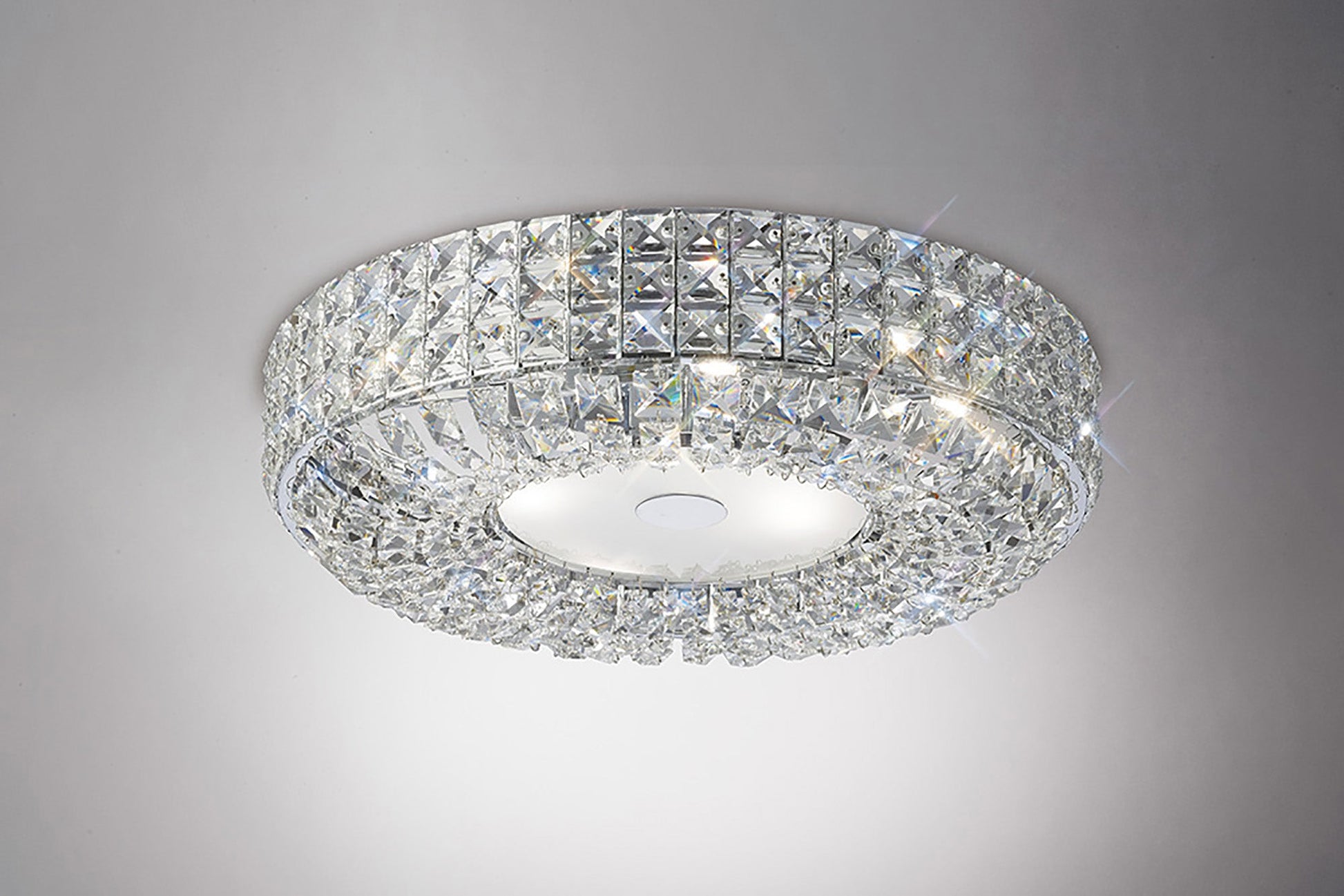 The focal point of this collection has to be the vast amount of square Asfour crystals that make this flush light fitting truly unique creating an immense sparkle of lighting array.