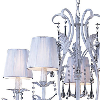 A range of fine iron work in a White Gold hand finish, metal crafted leaves and matching glass droplets. With matching silk string shades makes this family suitable for low energy lamps.