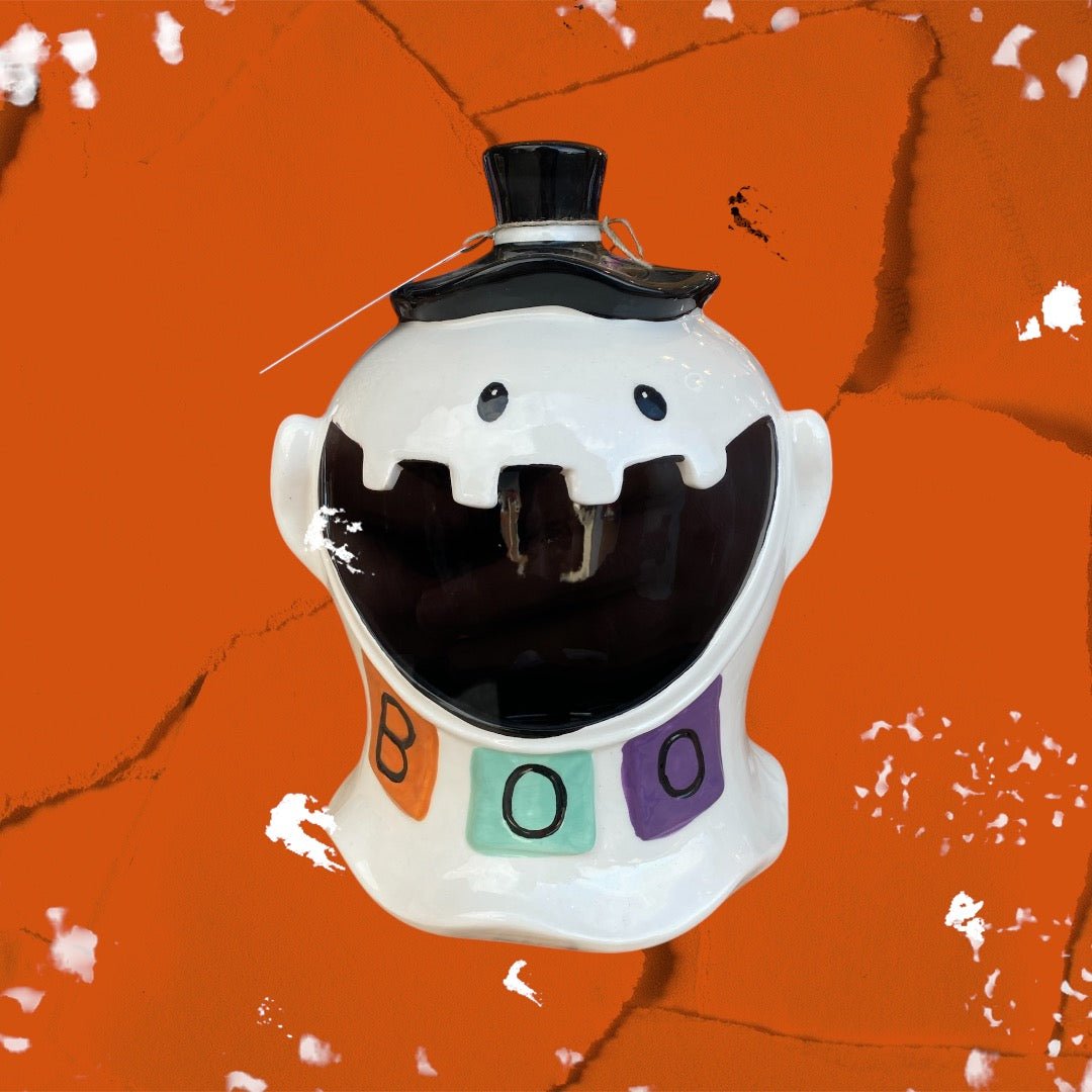 Halloween ceramic ghost with a wide open mouth ready to fill with delicious treats or add a LED Tealight for a spooky lamp
