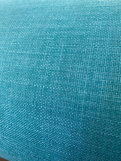 It has a vibrant pattern of william Morris cream and gold flowers on the interior and the exterior a teal linen