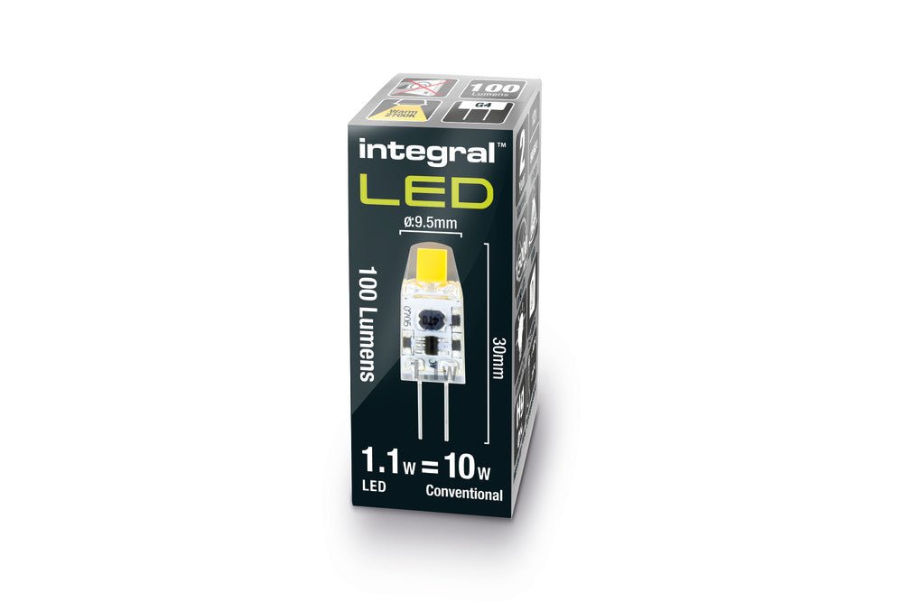 Integral LED G4 lamps run at less than 1W and offer a lifetime of thousands of hours more than their halogen equivalents. This makes them an ideal retrofit for existing G4 fittings.