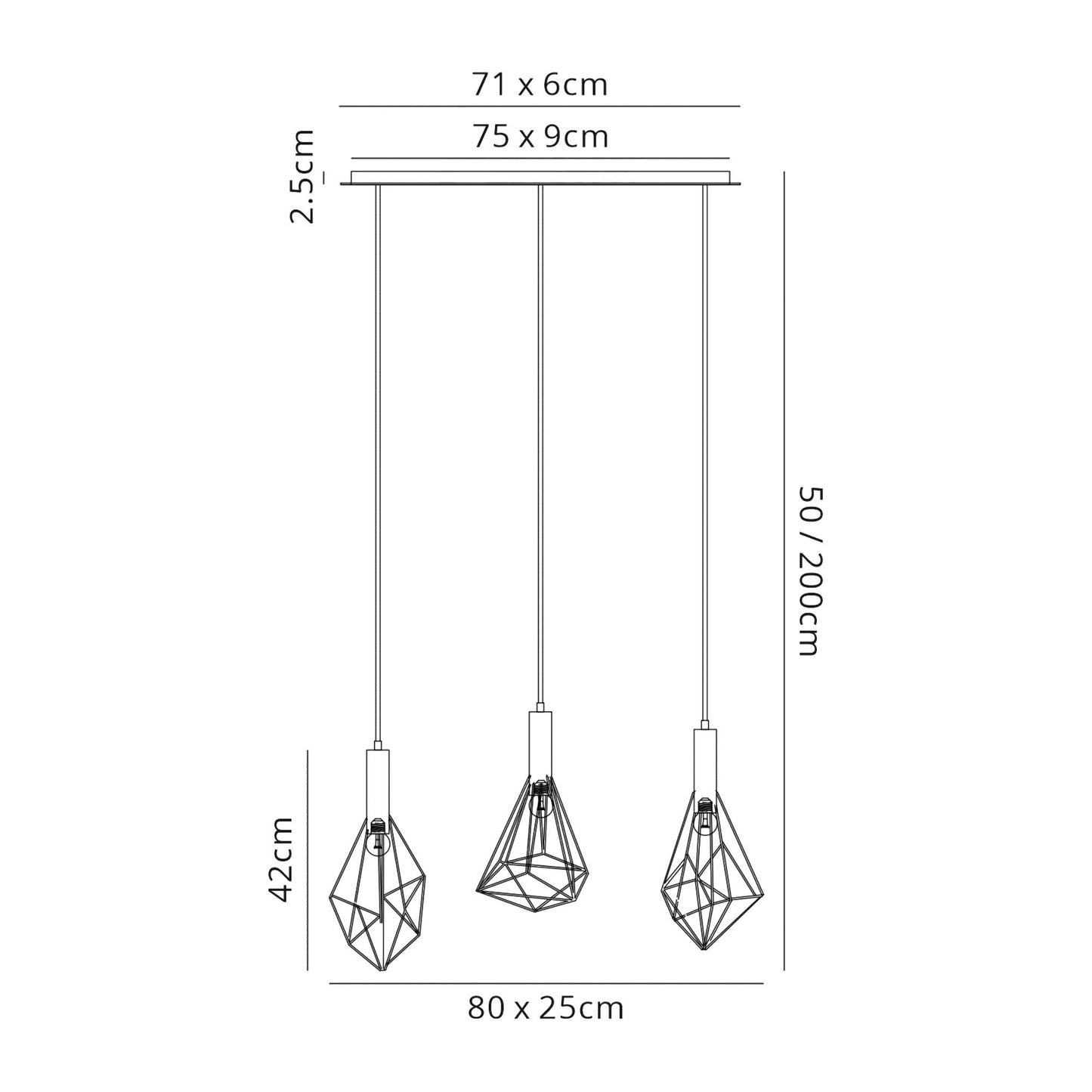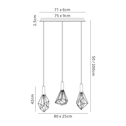 The black metal framework surrounding the E27 lampholders creates an open prism effect. The singular pendant incorporates a large framework prism and the 3 lights in a round or linear format use the same design in varied shapes.