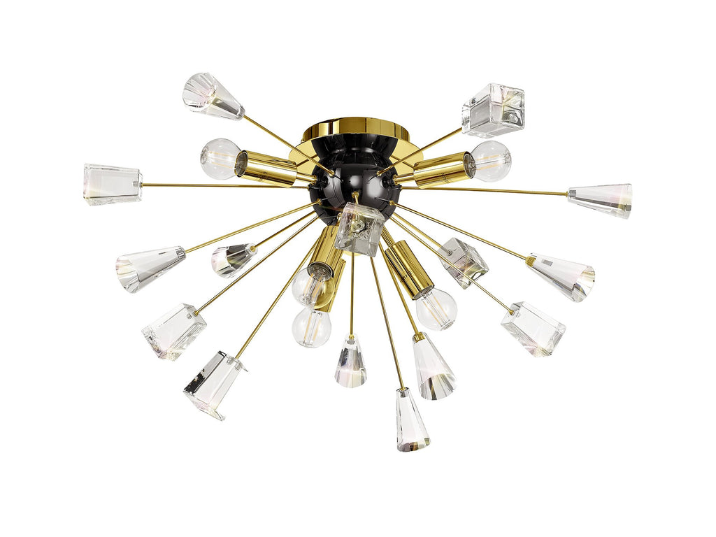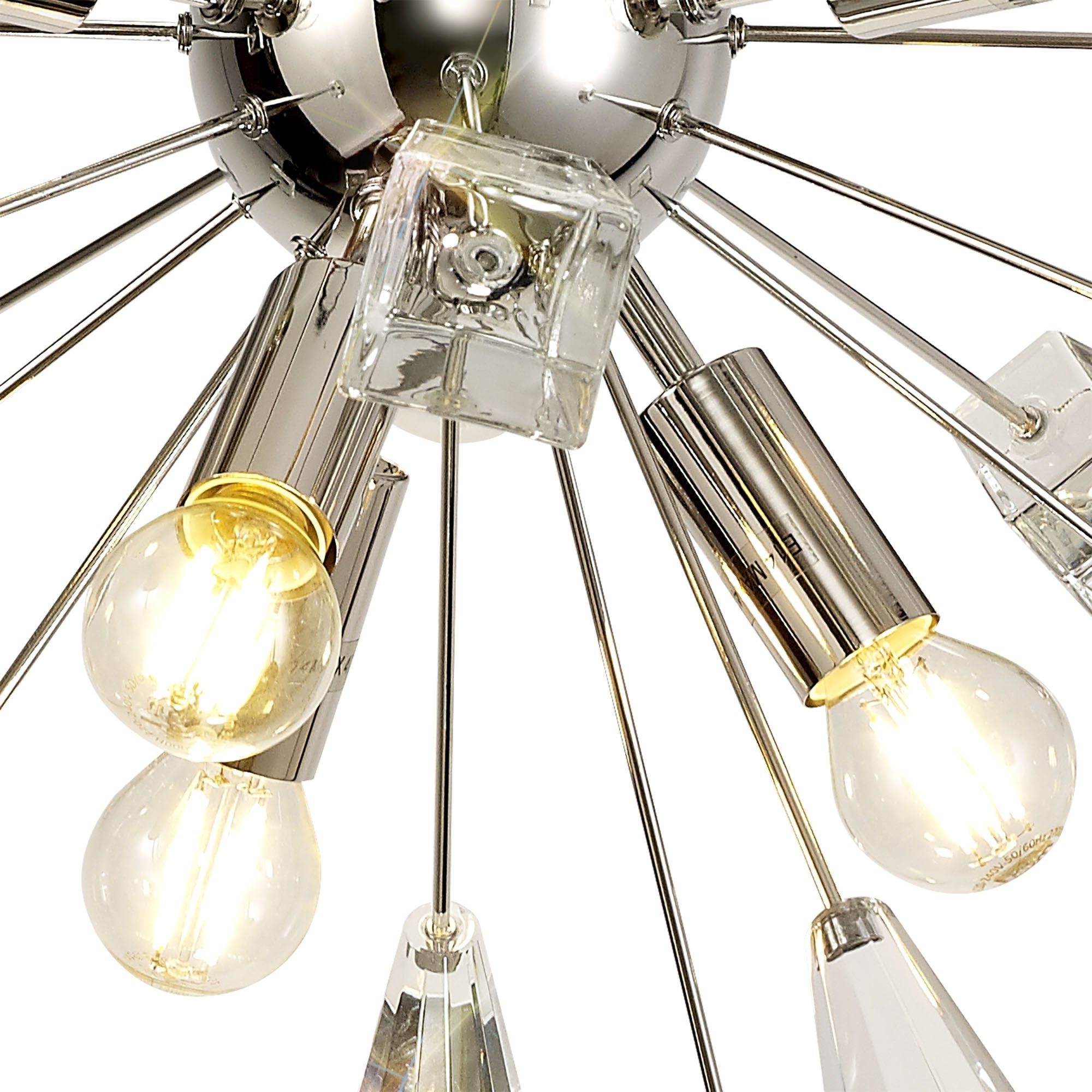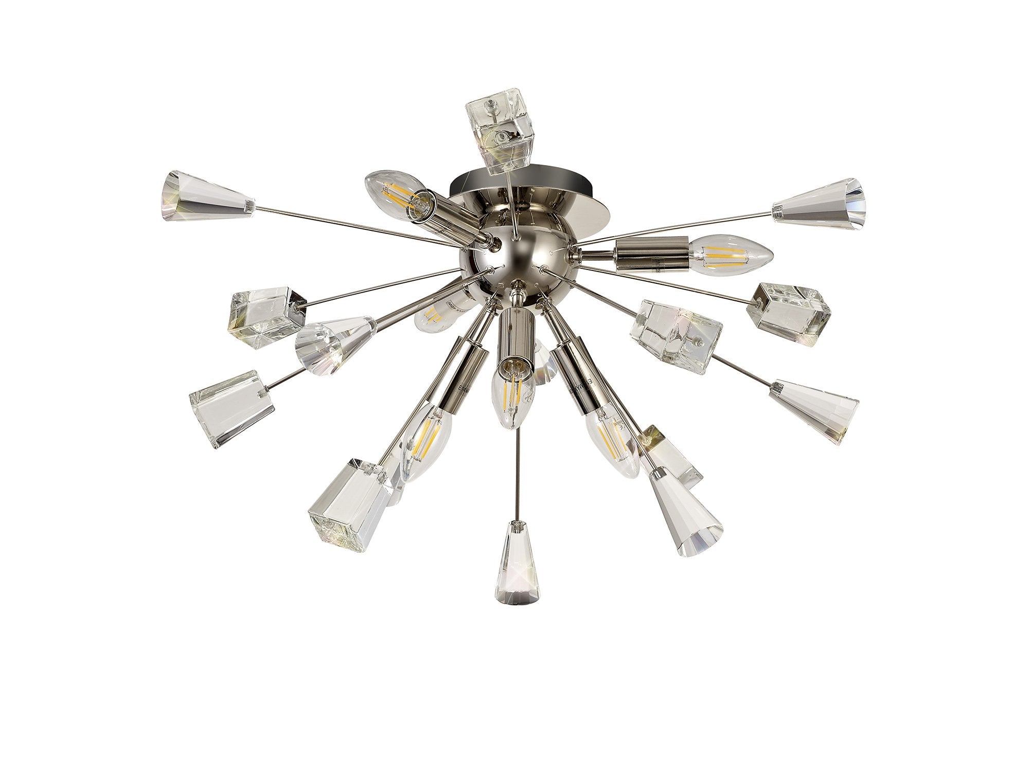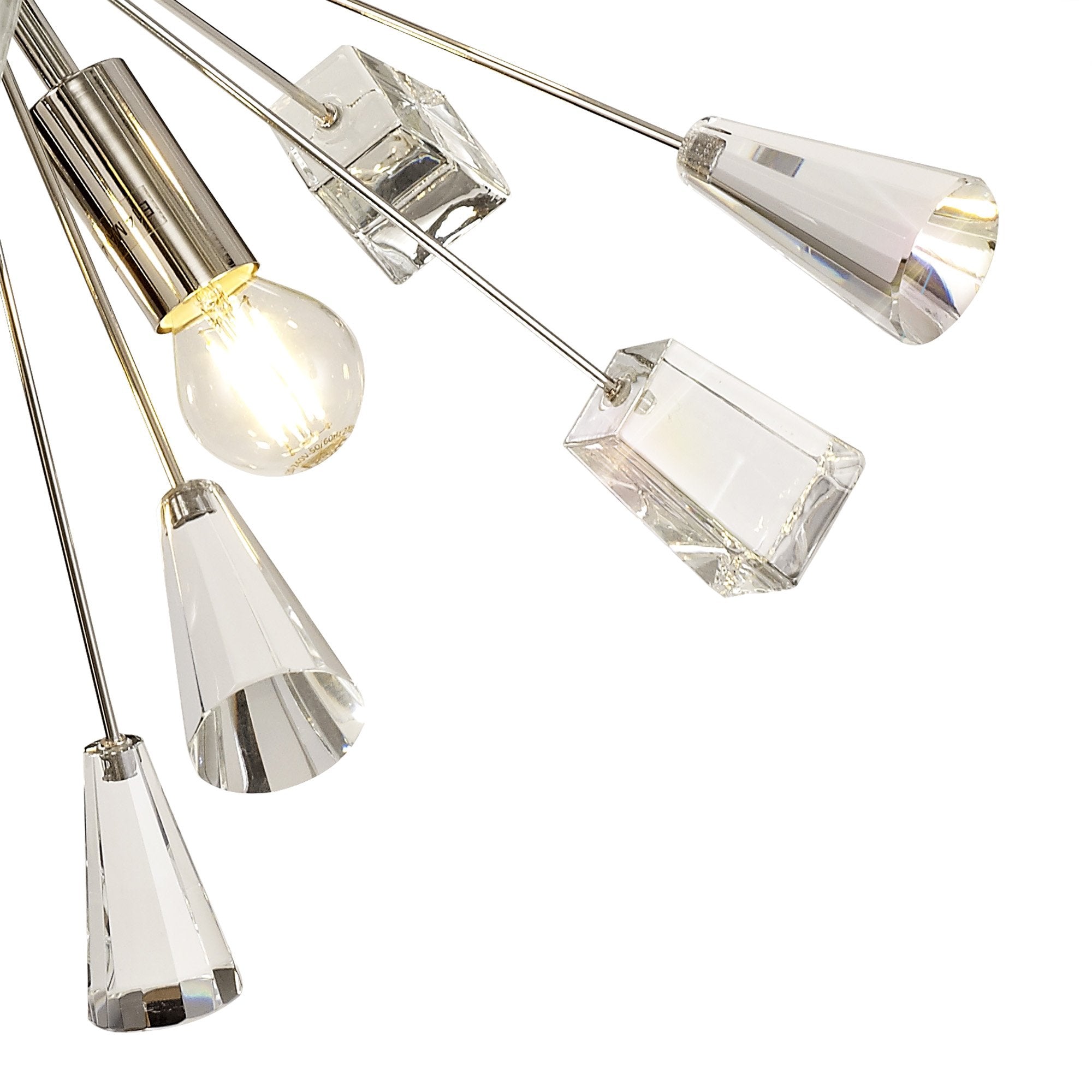 Its dome centrepiece is surrounded by protuding rods adorned with cut crystal cones and matching glass trapezoids.