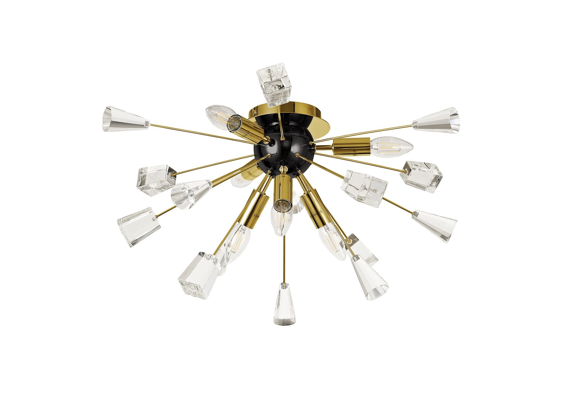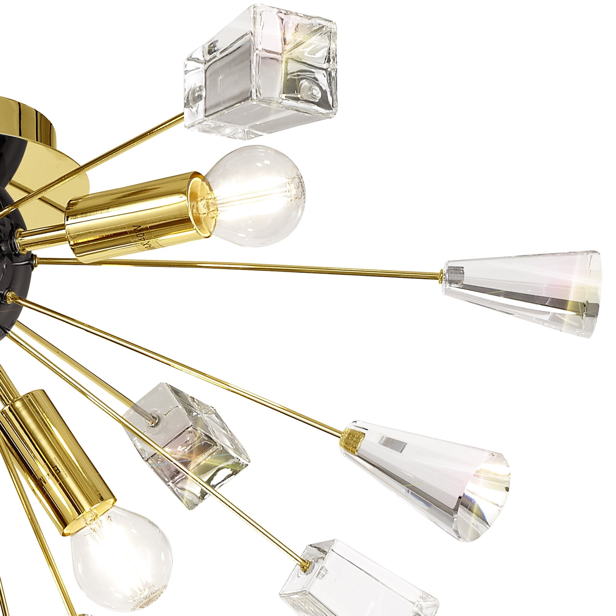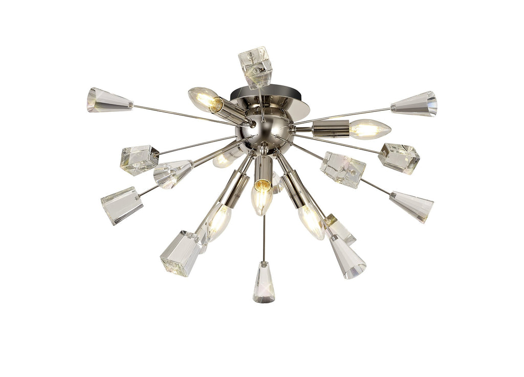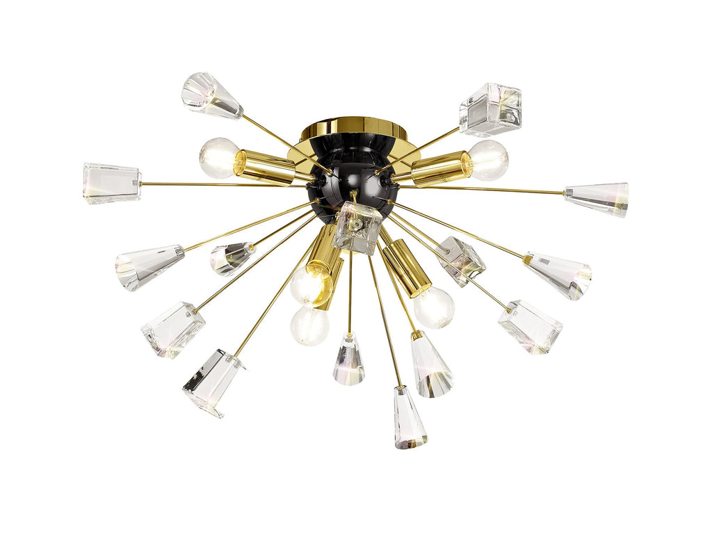 Its dome centrepiece is surrounded by protuding rods adorned with cut crystal cones and matching glass trapezoids.