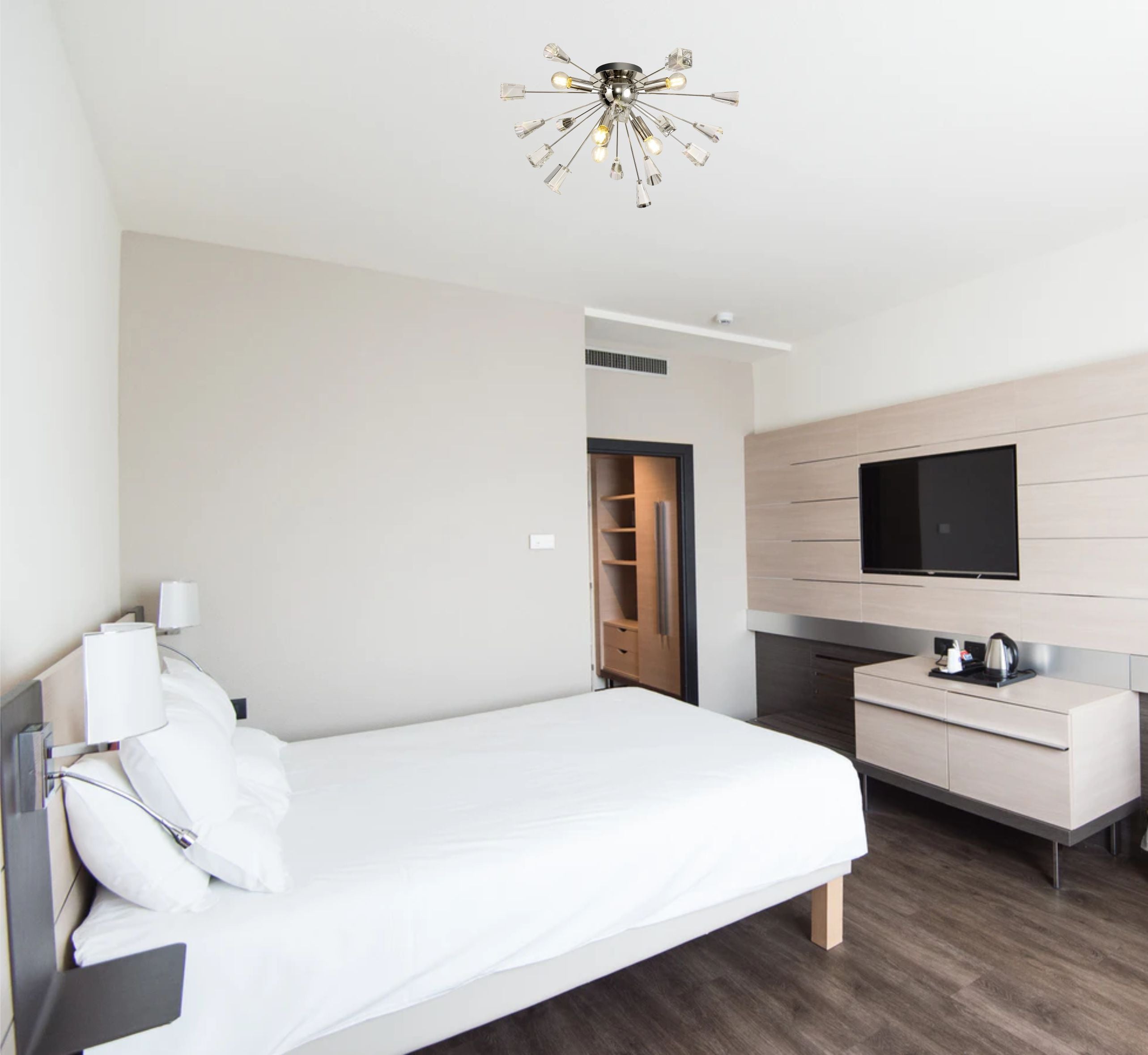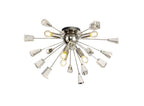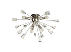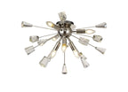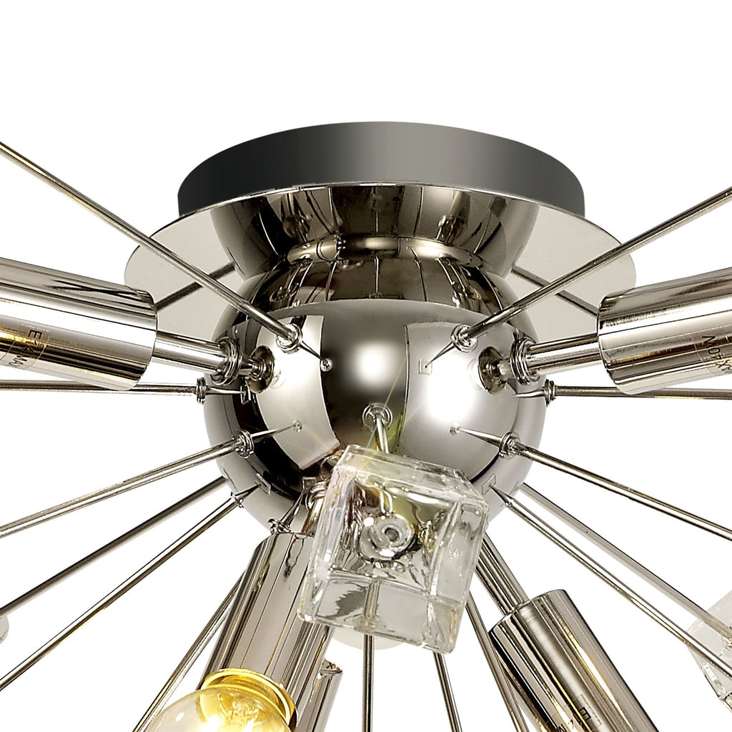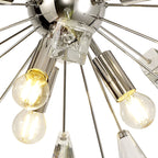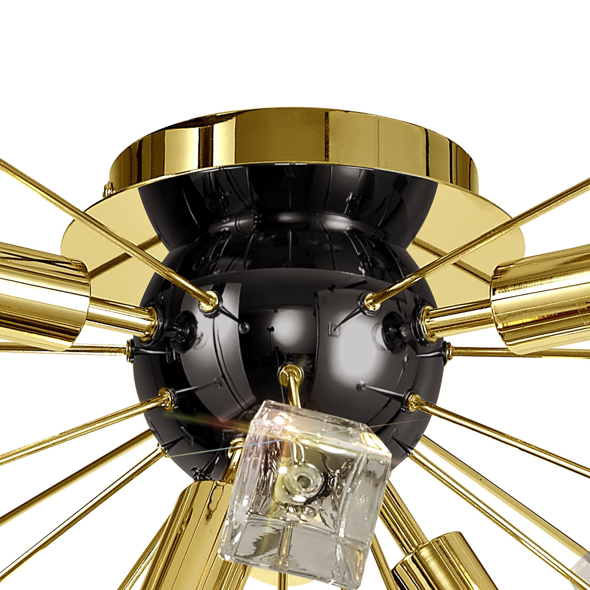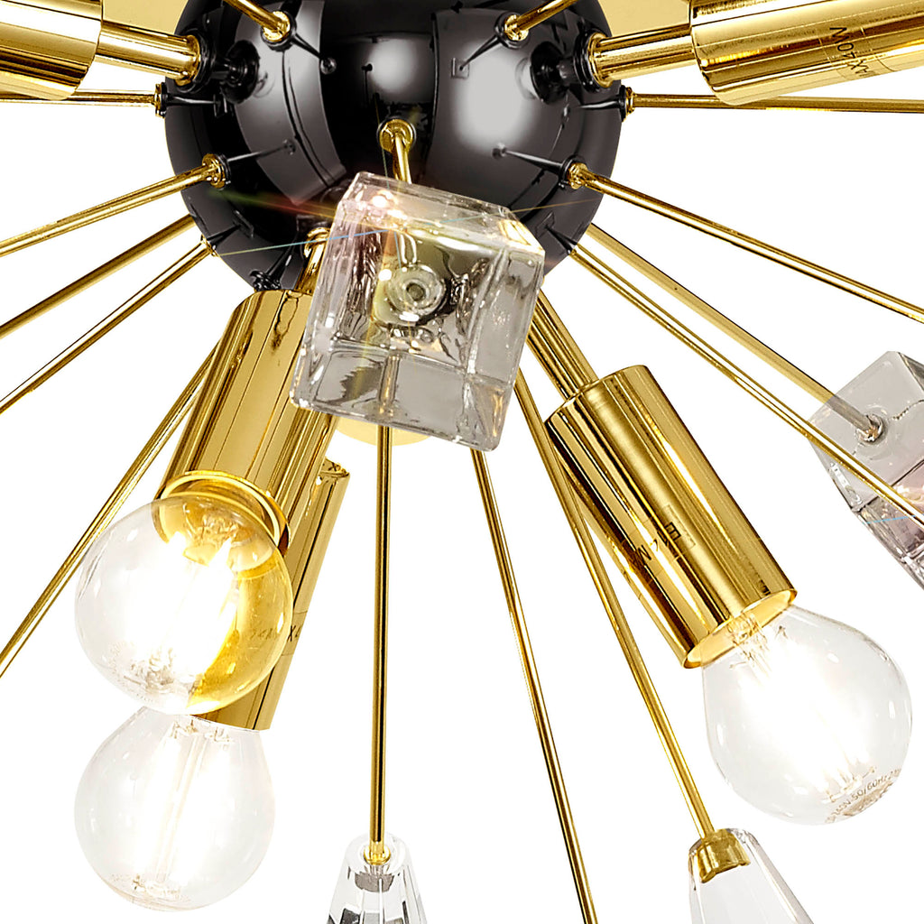 Its dome centrepiece is surrounded by protuding rods adorned with cut crystal cones and matching glass trapezoids.