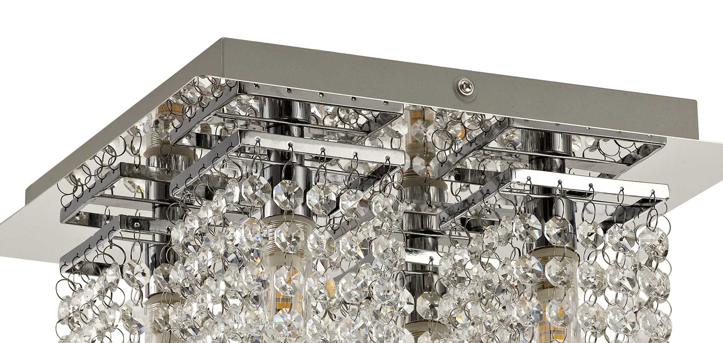 Its unassuming chrome background reflects the strings of crystal buttons that dangle round a G9 lampholder.