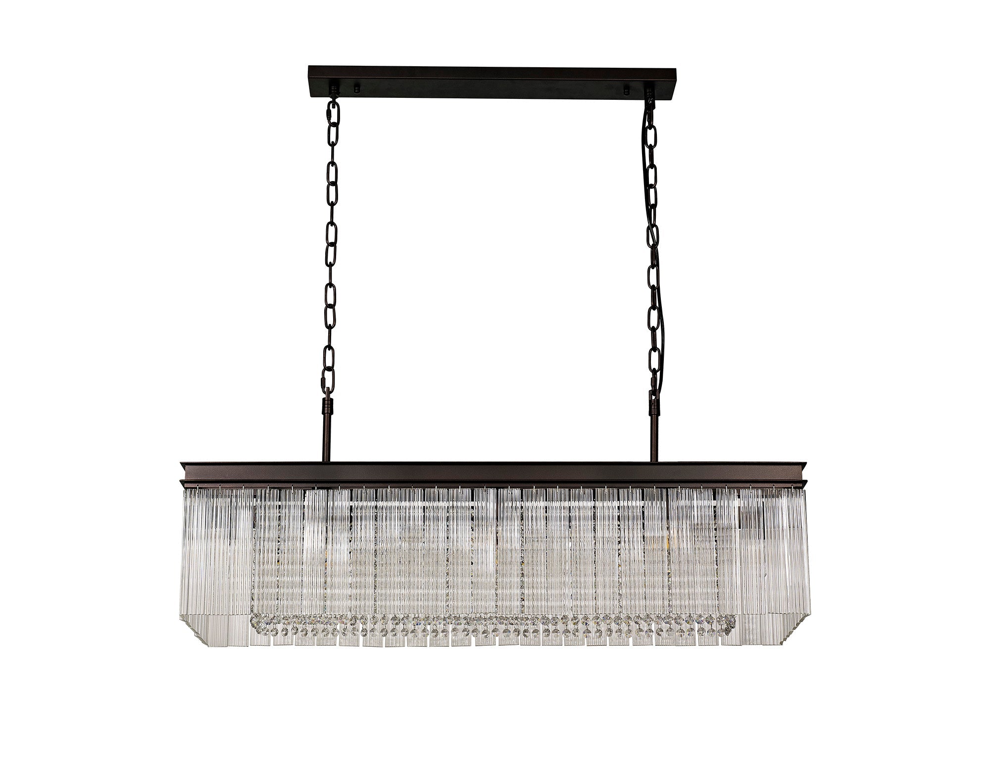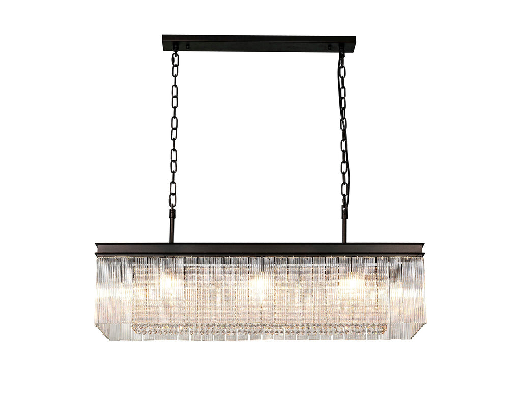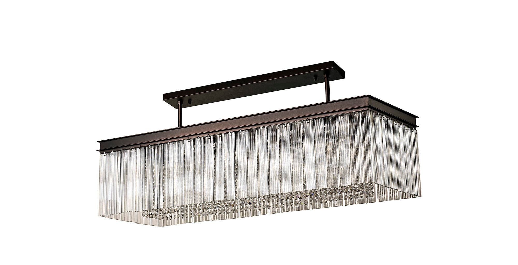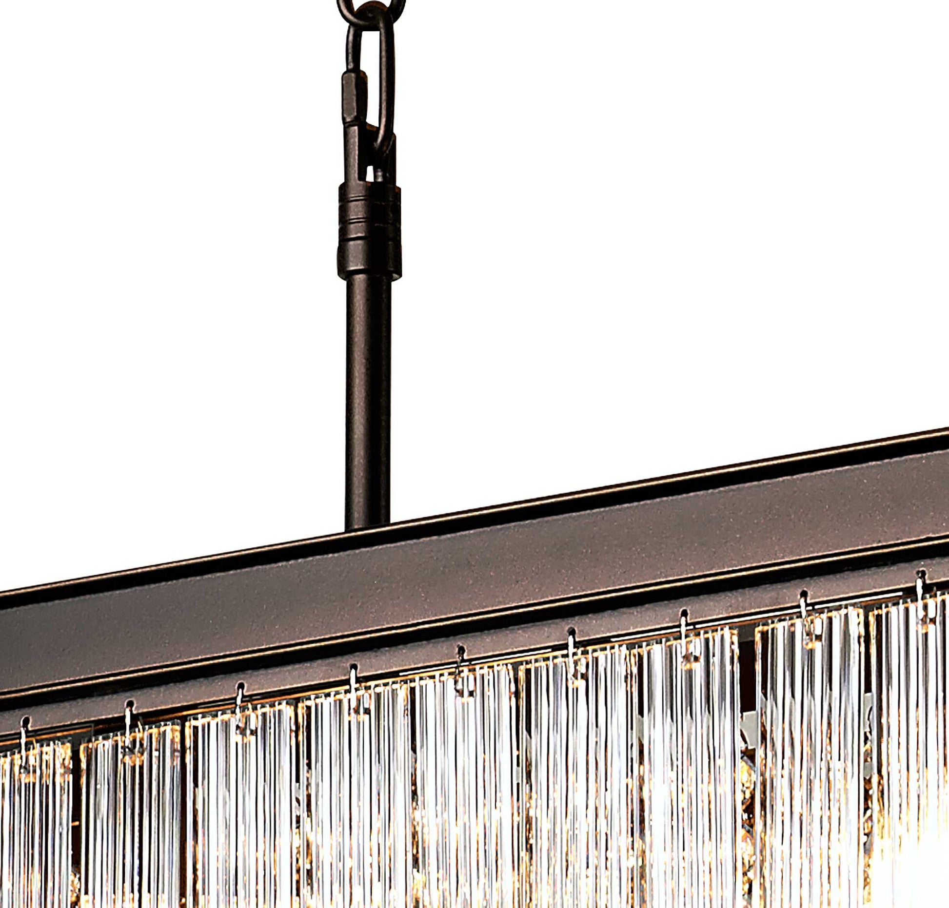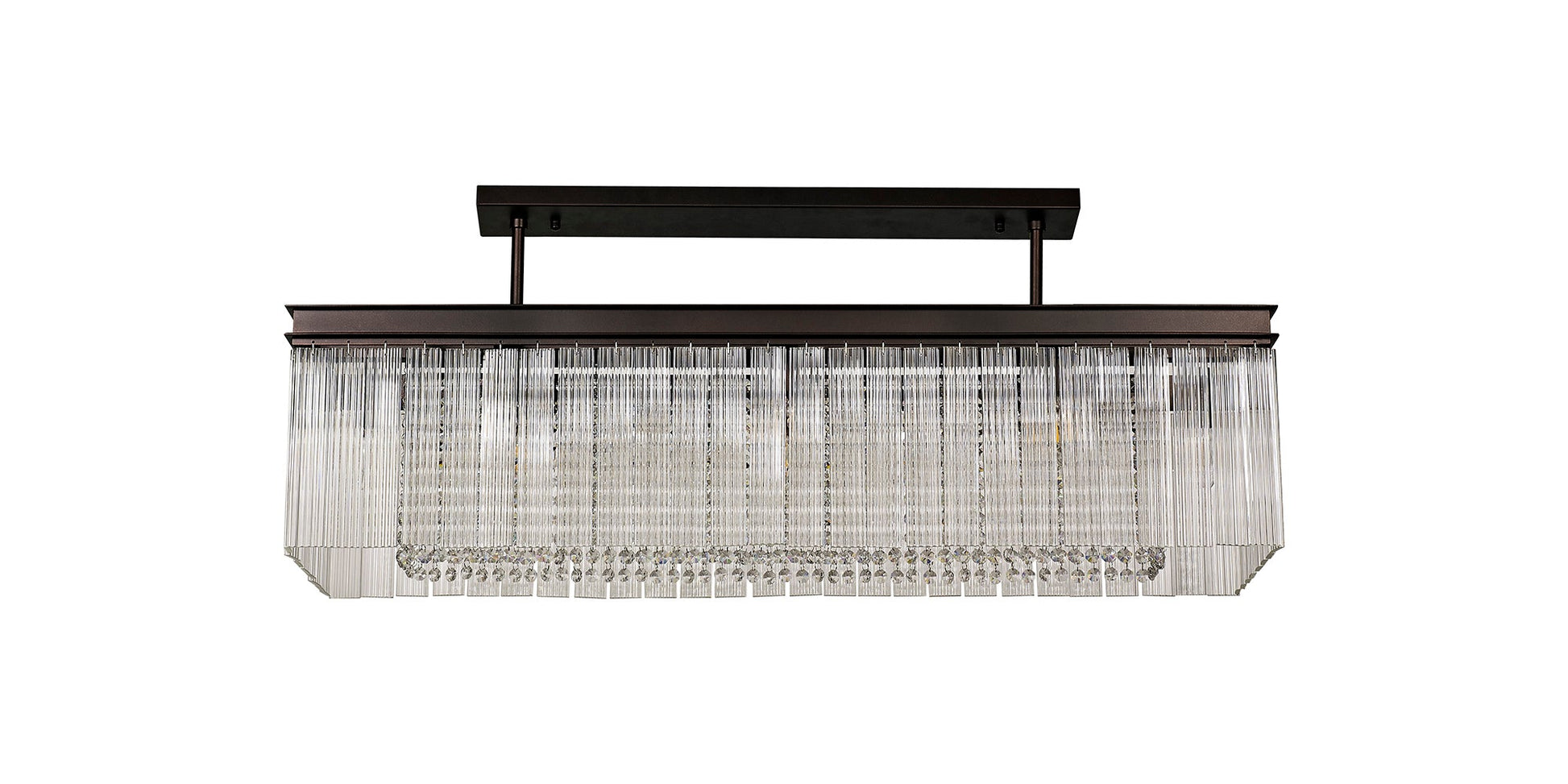 Its solid framework is a deep iron oxide colour and trimmed with slivers of rippled glass which capture the light diffusing it gently. Its high numbers of lampholders work together with this to give a bright but non harsh illumination.