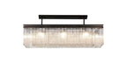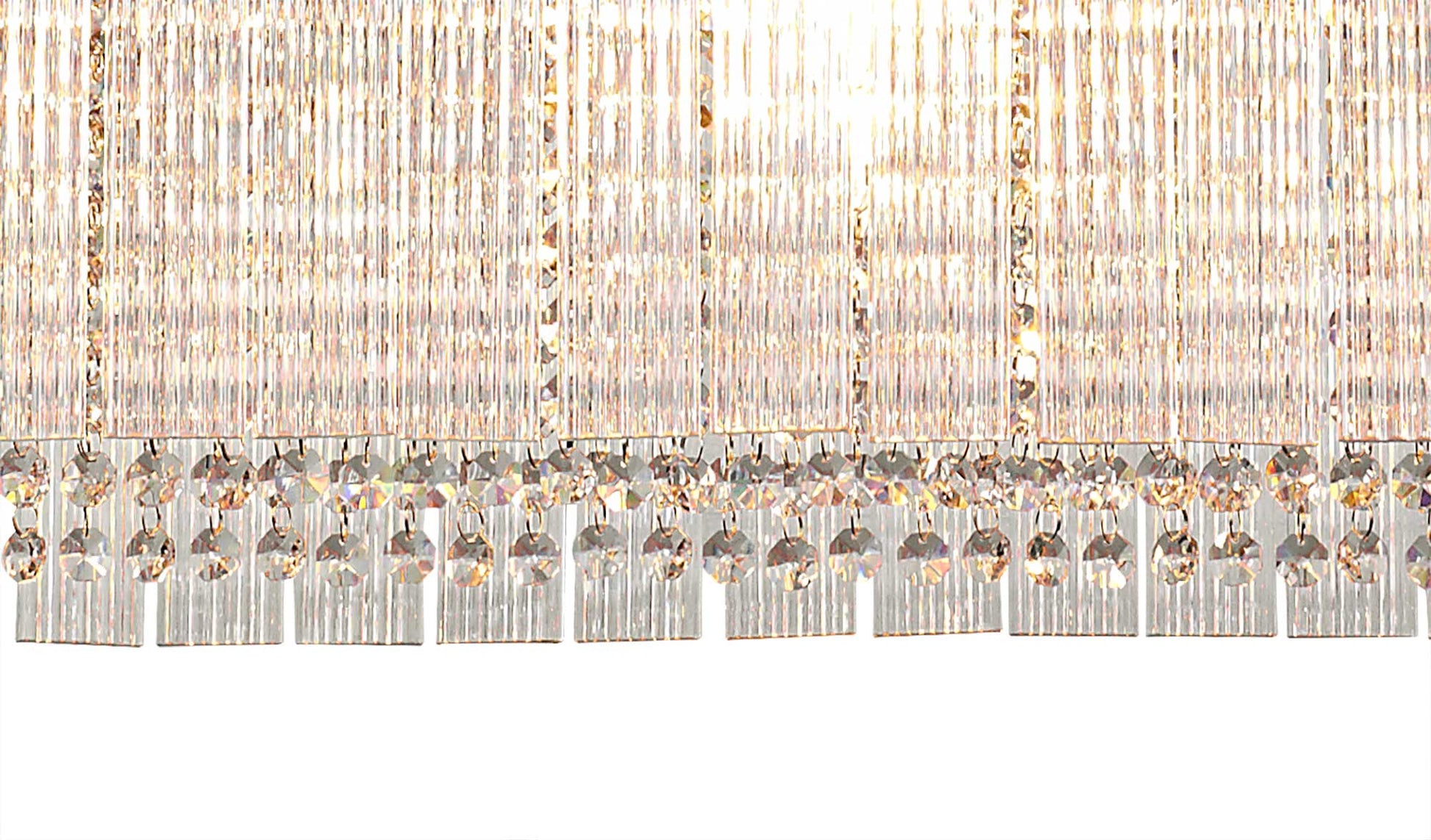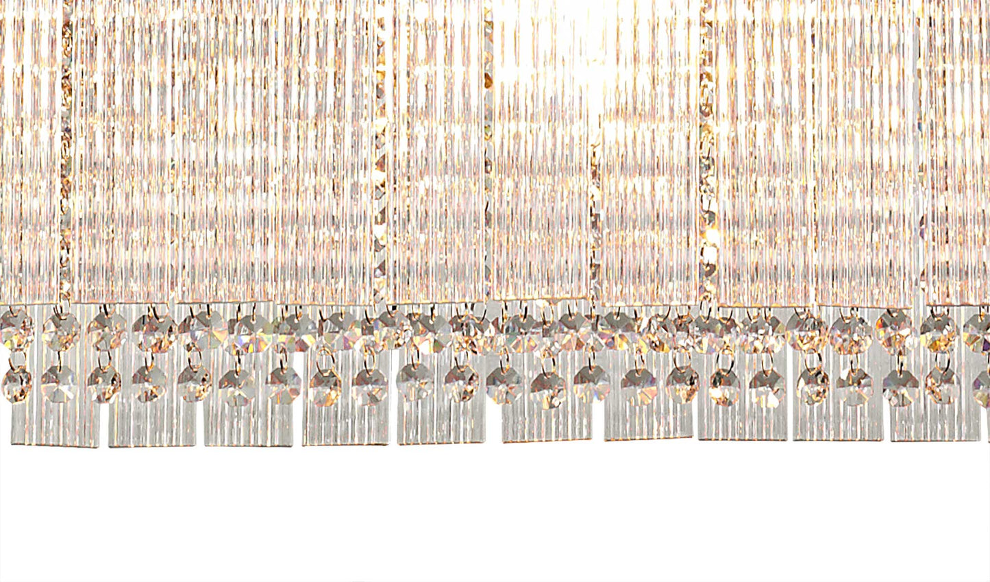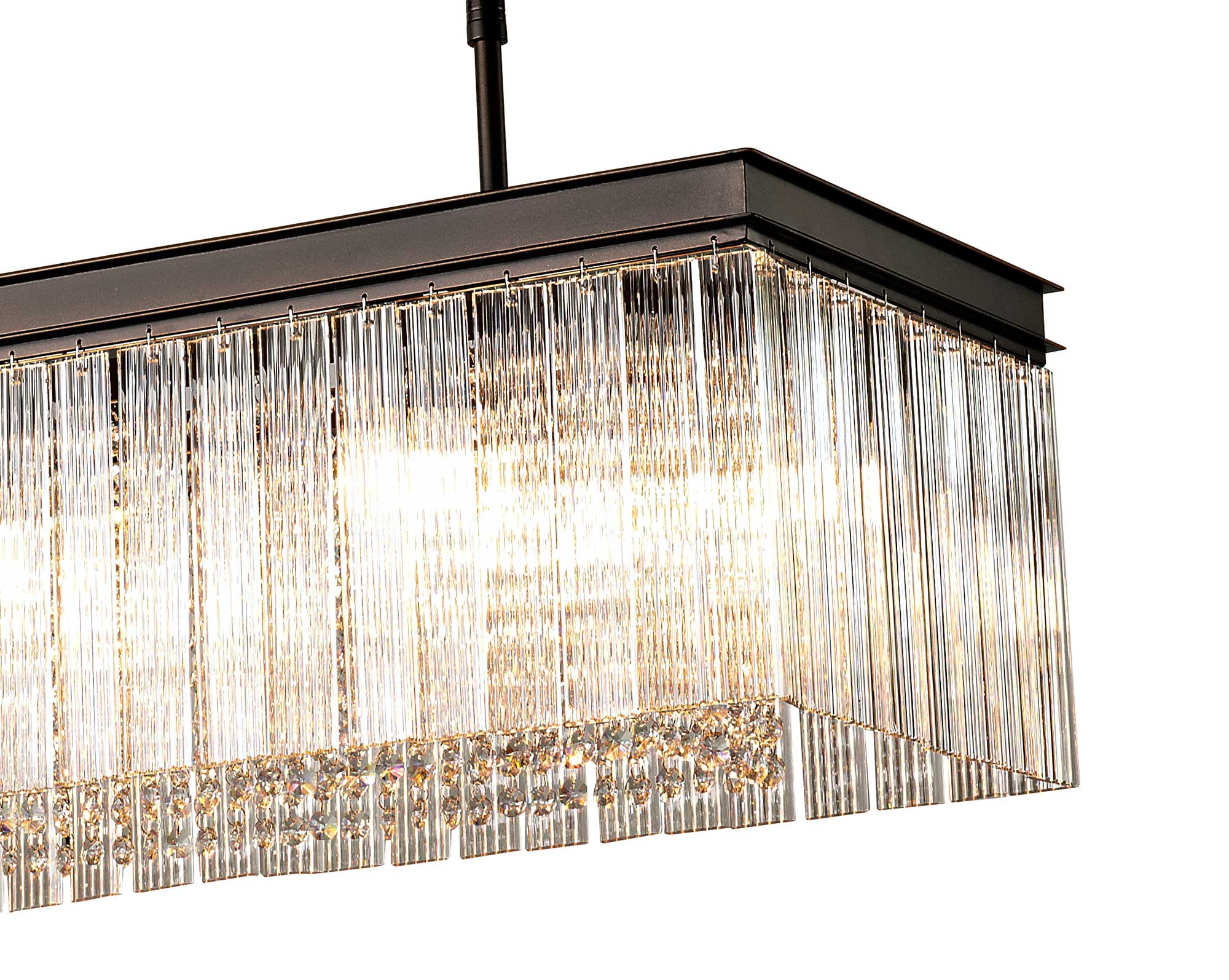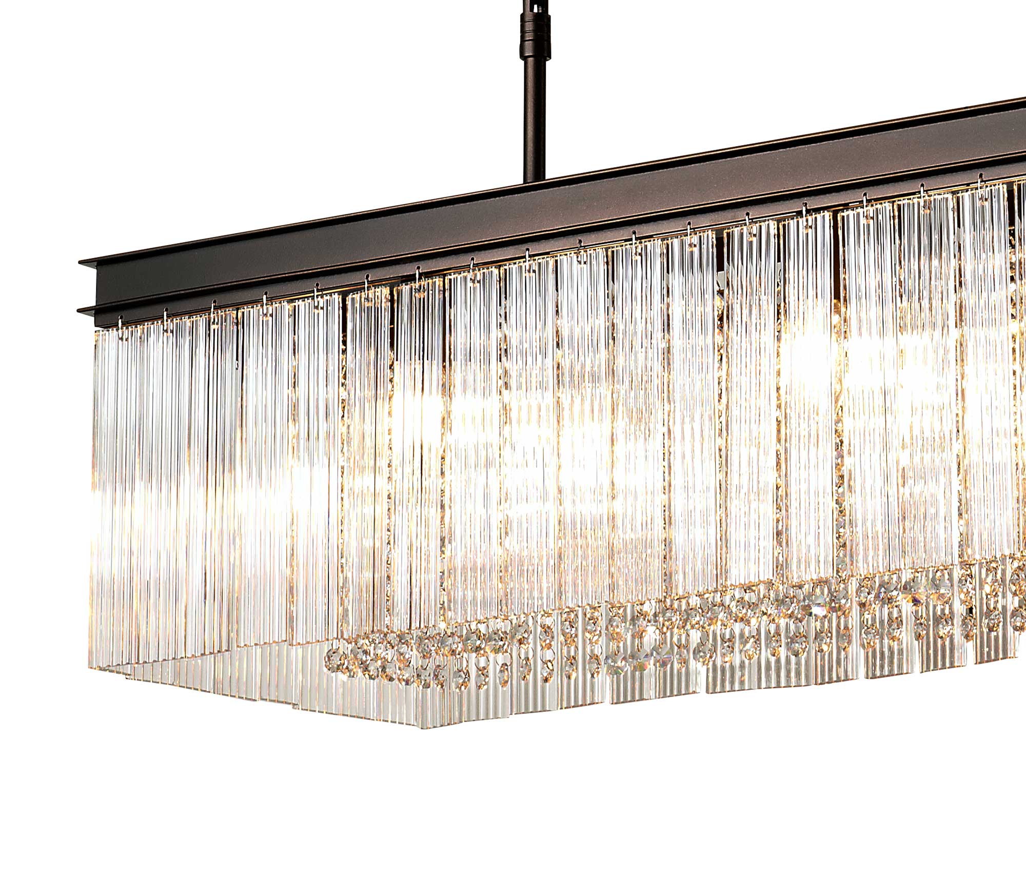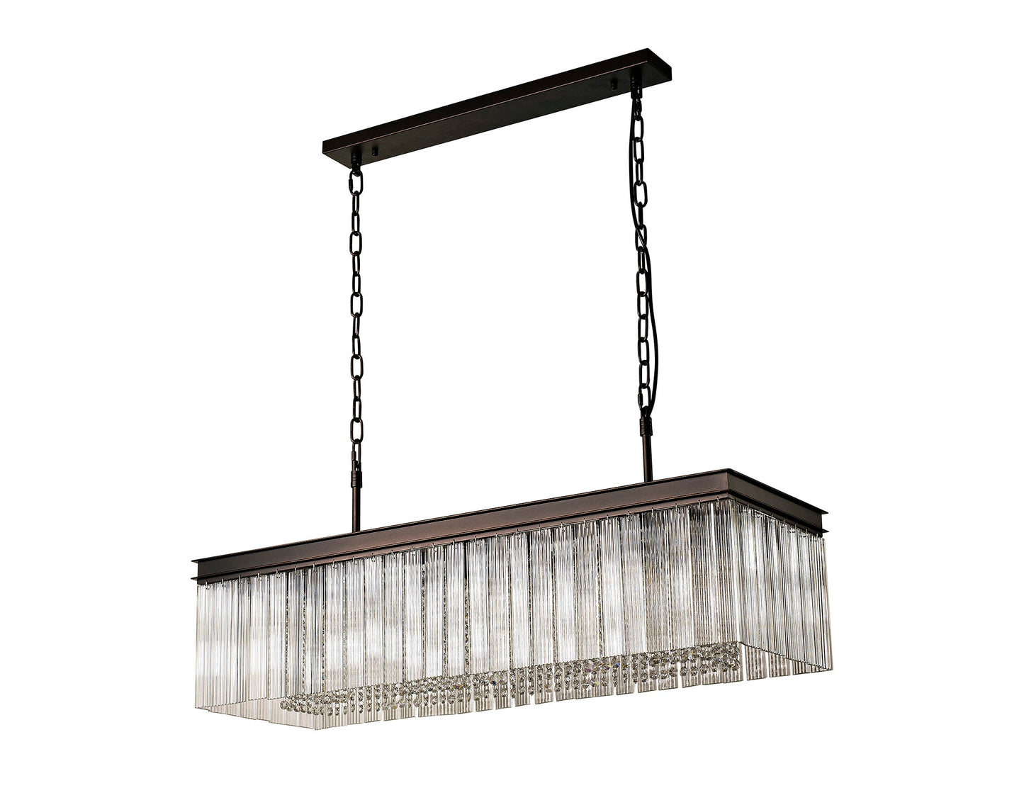 Its solid framework is a deep iron oxide colour and trimmed with slivers of rippled glass which capture the light diffusing it gently. Its high numbers of lampholders work together with this to give a bright but non harsh illumination.