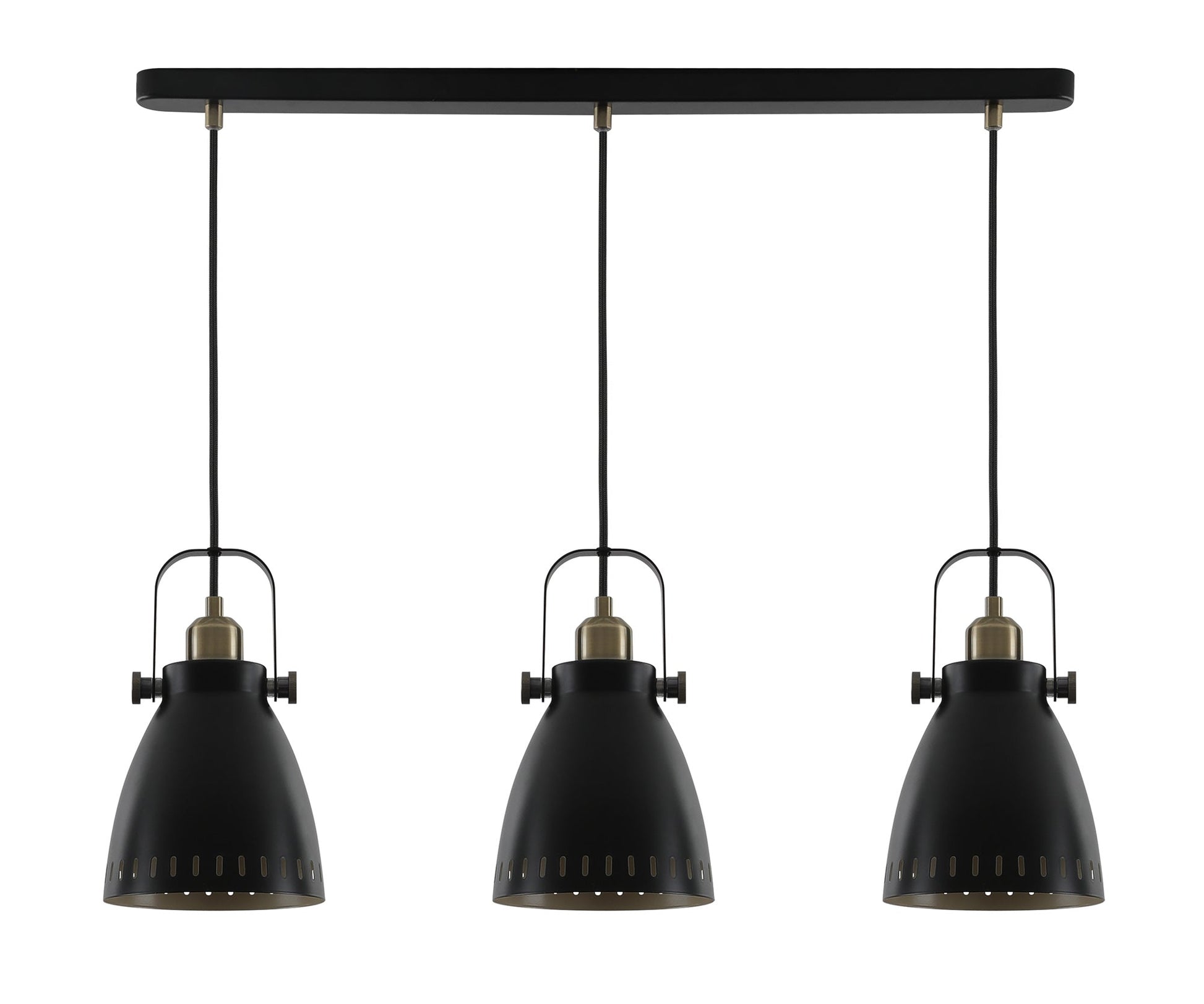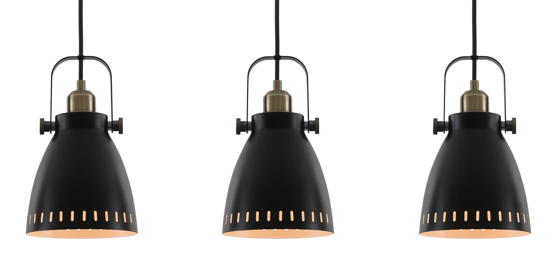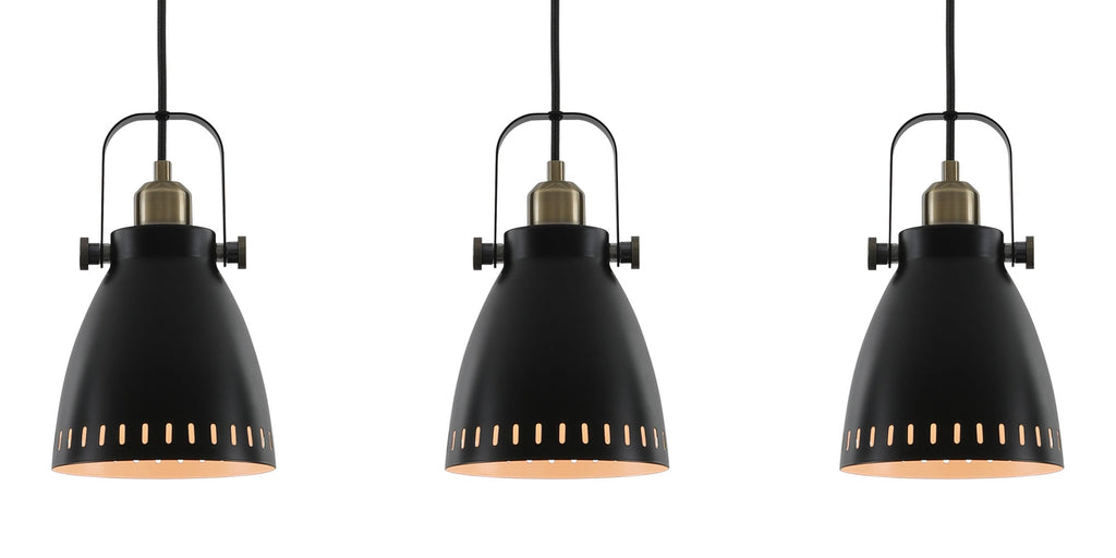 This basic but stylish collection consists of matt black industrial style shades and fixings with brass accents and a pale khaki lining. A full seleciton of pendants, bars, lamps and wall lights are available at a non budget breaking price.