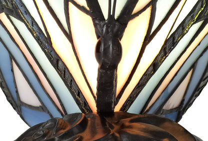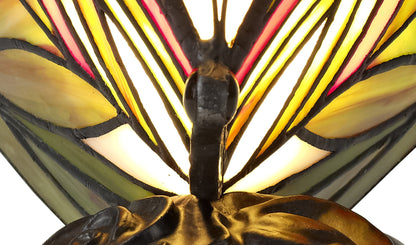 Its delicate translucent wings are made from a variety of hand made coloured panels set in the tiffany bronze.