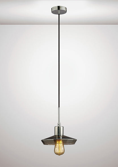 The black suspension cable is in keeping with the theme of the light complimenting the smoked glass and polished chrome ceiling plate and lampholder.
