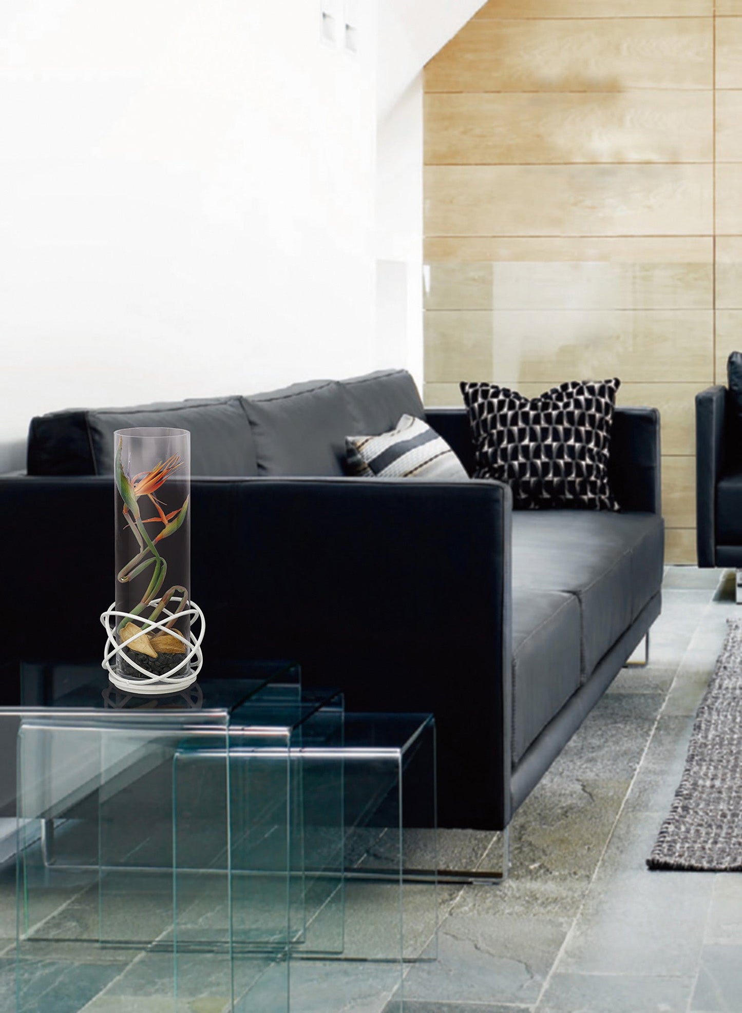 A central glass container enables many uses with primarily candle holders in mind but also allowing a more ornate table decoration with endless options. All of this range is available in either a White or a Black finish.