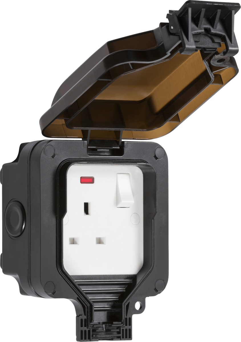 Outdoor single/twin power socket with power on/off indication that can be seen through the transparent lid.