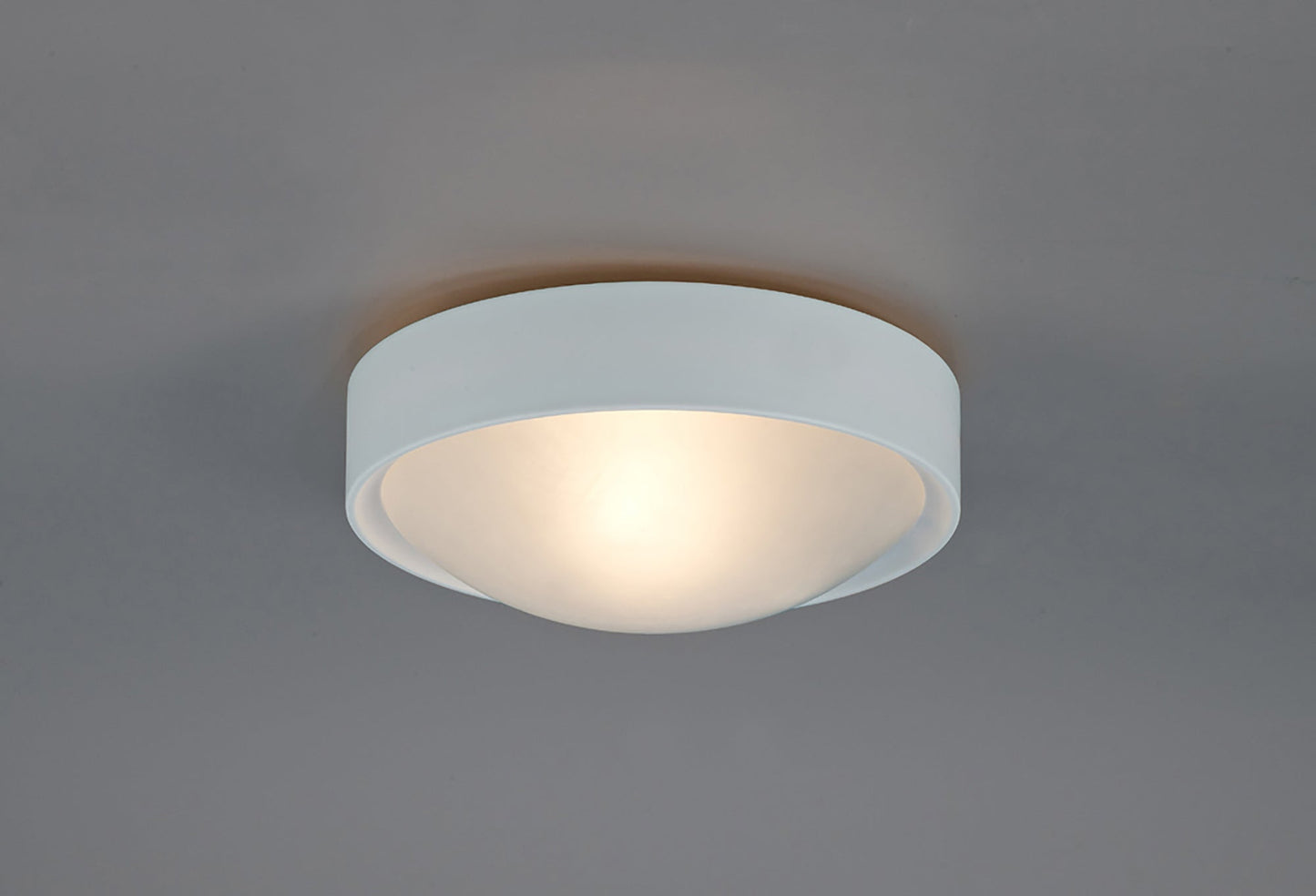 The slightly domed frosted glass is set against a deep round frame available in either satin nickel or white.