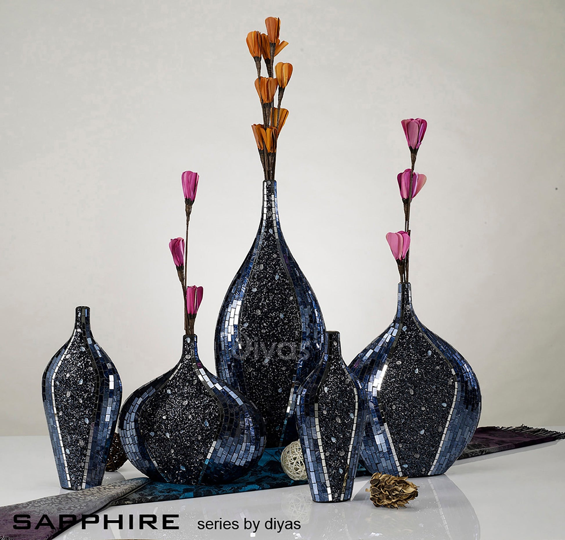 The hand made glass mosaic range from Diyas Home is perfect for anyone looking for that special finishing touch to their interior design. Each range is full of unique shapes, designs and colour combinations.