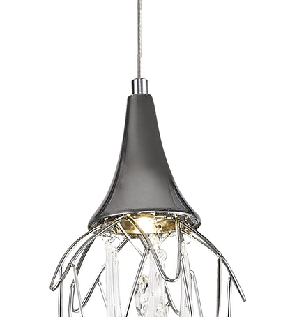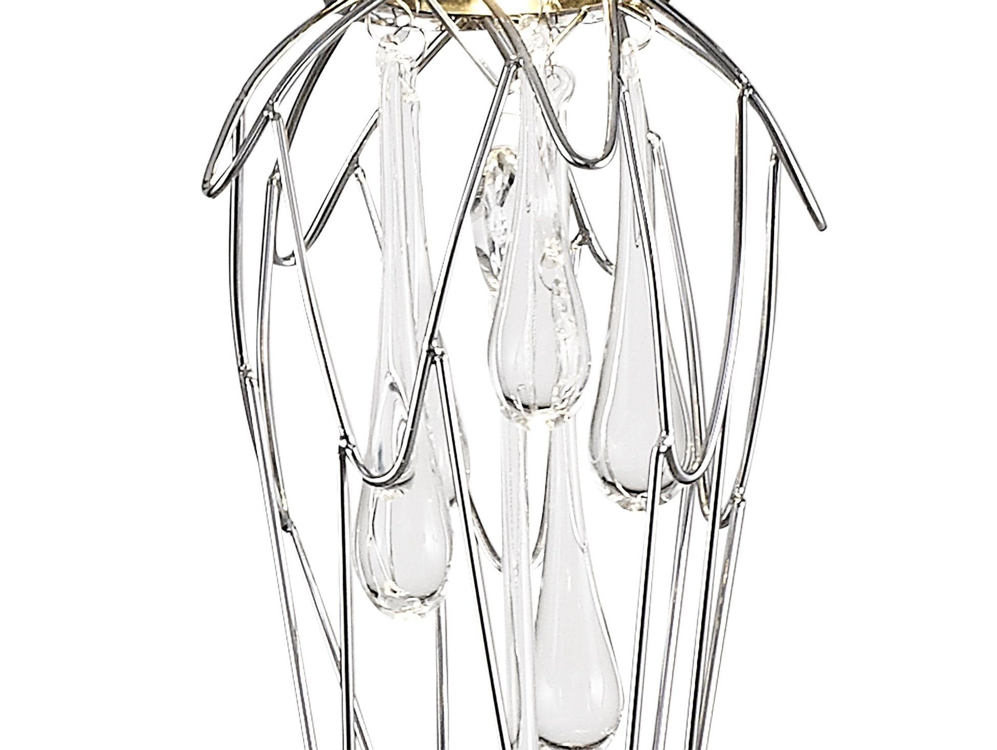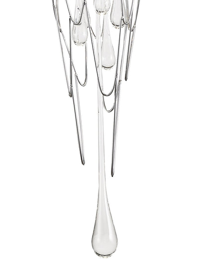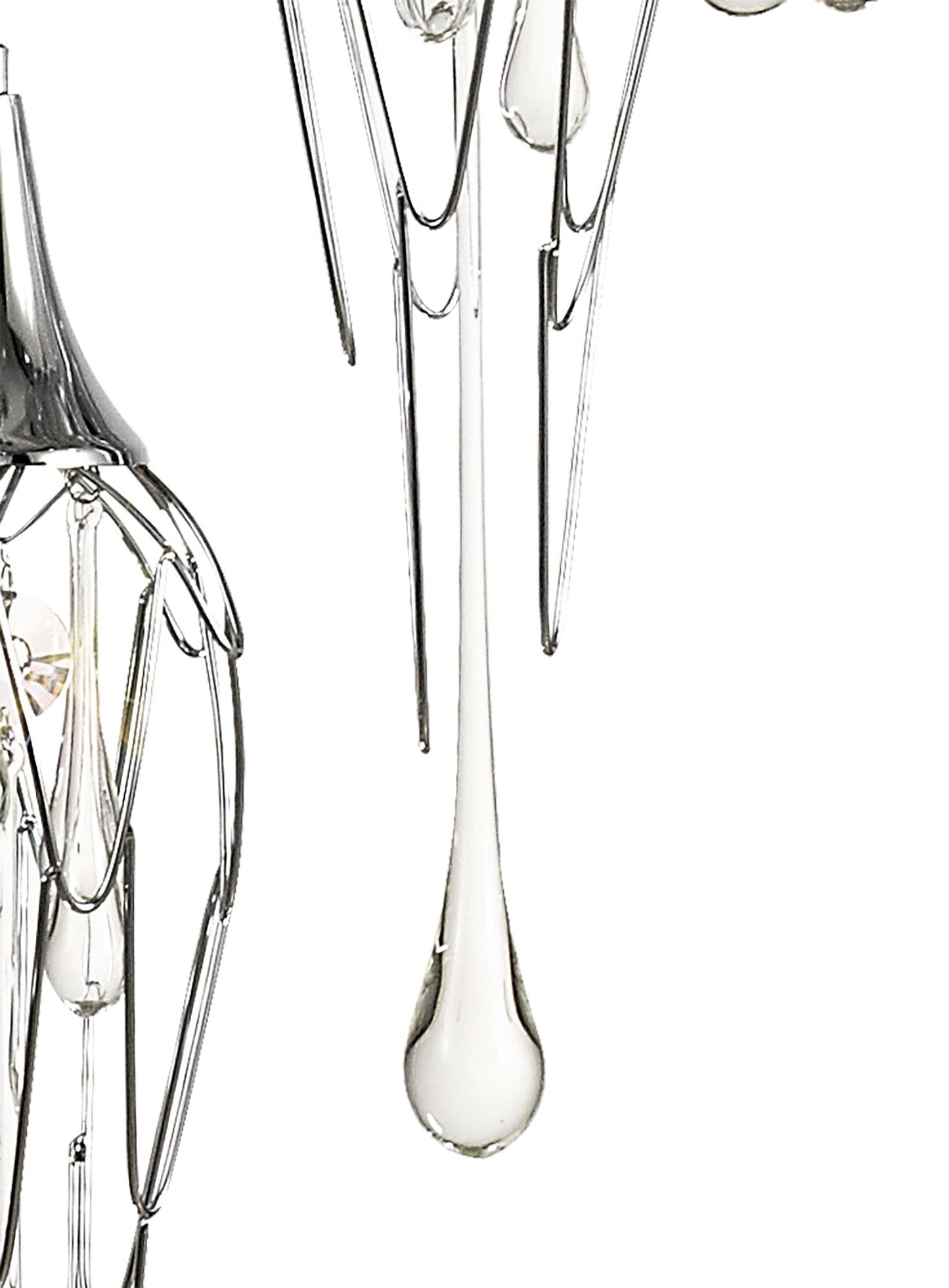 The Solstice range is an ethereal piece which captivates the eye and the imagination. It sparkling fitting and framework form the shapes of melting icicles hanging from almost gossamer thin wires. Over the top of the framework is sculpted beautiful lead crystal droplets that sparkle with each breath of wind. Each droplet houses a full size GU10 Bulb