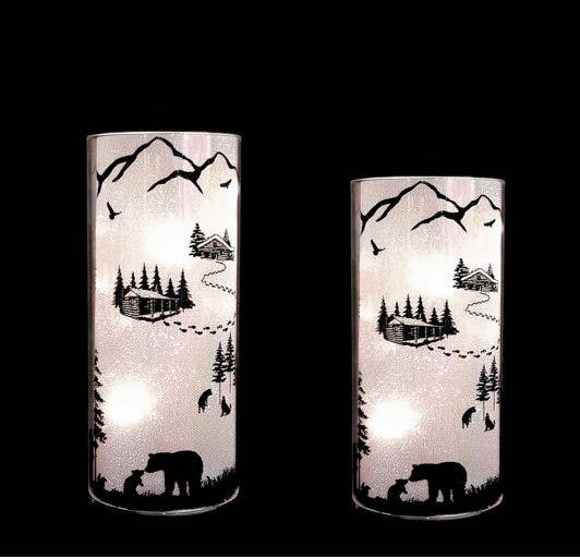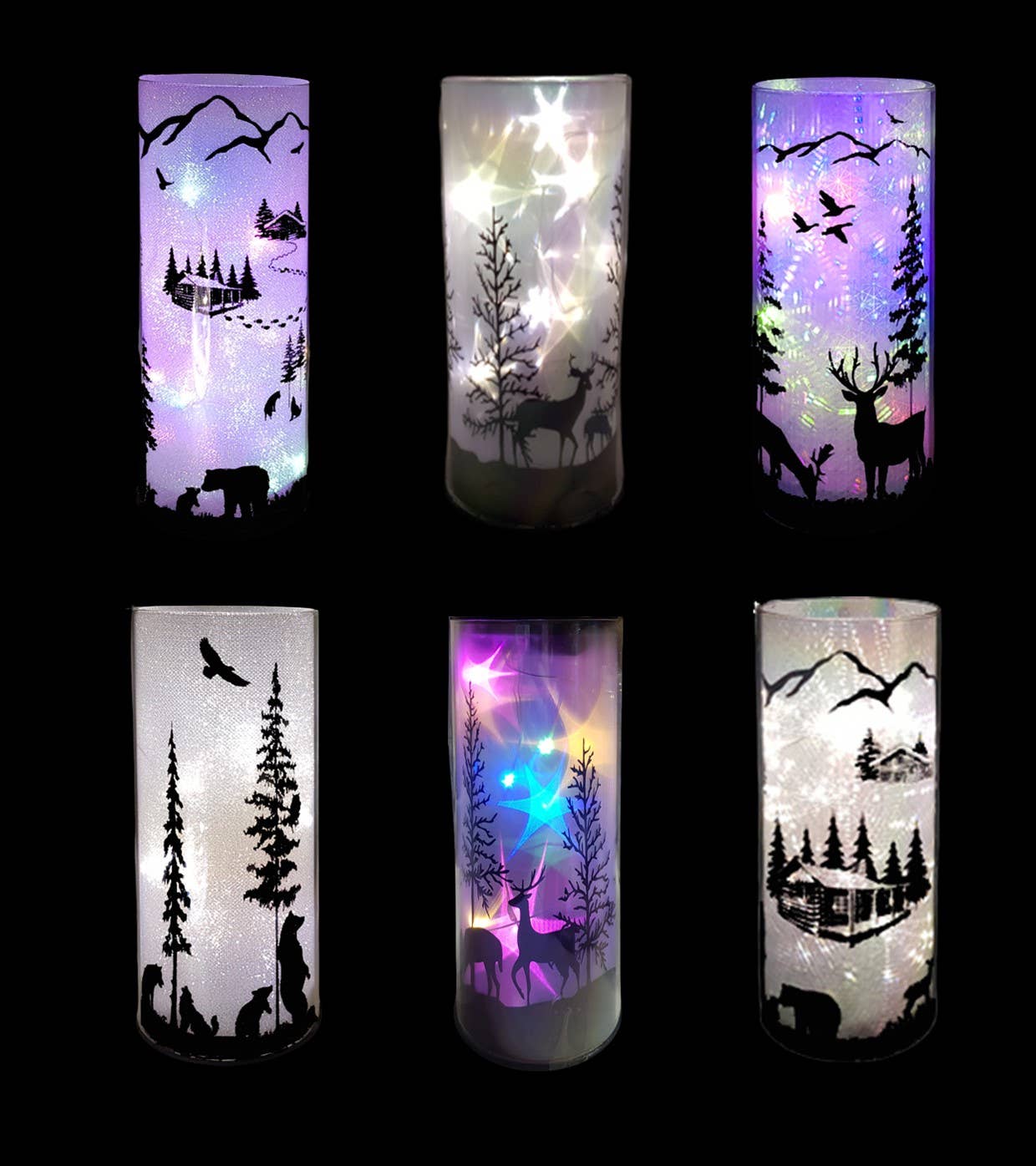 A sophisticated Frost-effect film lining the lamp splits up the light from the dozen internal warm white LEDs into a myriad points of light which then frame a snowy mountain scene, giving a bright glistening frost effect to the entire lamp. The high-quality moulded glass has a thin layer of an iridescent film, and this discrete rainbow sheen is enhanced by the two-tone light from the LEDs which display gentle shades of lilac and gold throughout the sparkling frosted landscape.