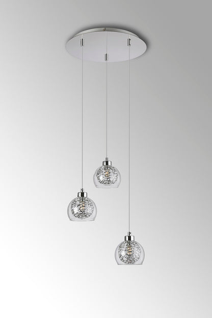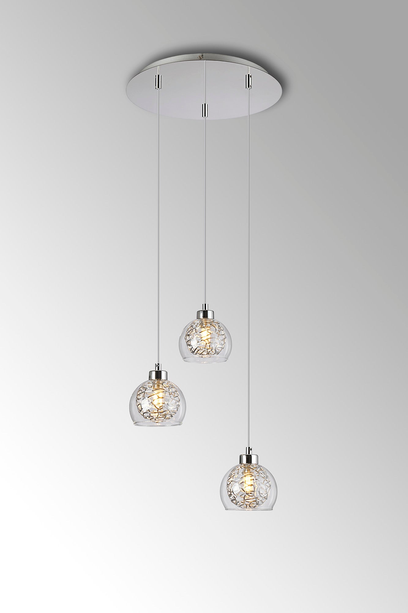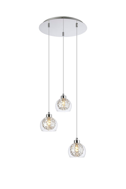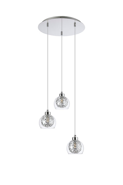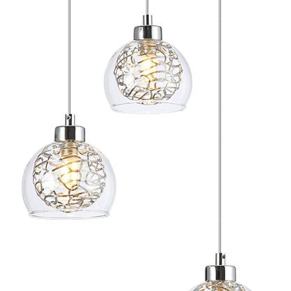 This round silver shade is formed of narrow ribbons of metal, entangled to create an artistic pattern and design. Together these components combine to form an intriguing shade to encircle the G9 lampholders.
