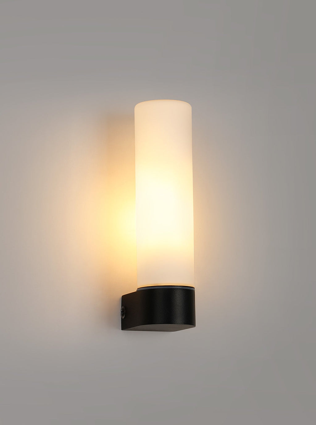 The IP44 Tasso wall lamps combine slim opal tubular glass with a minimal amount of polished chrome or satin black framework to ensure an optimum amount of light dispersal from the E14 lampholders concealed within the glass. The single wall lamp is fixed in a vertical position from the baseĀ