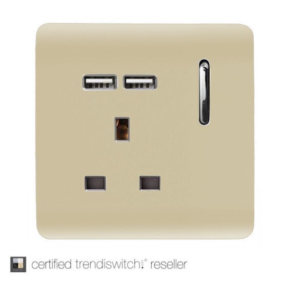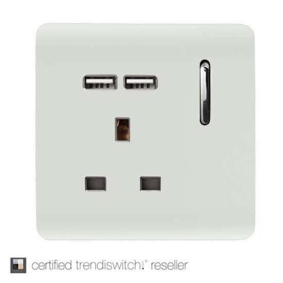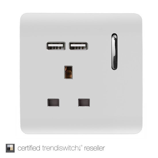 Trendi Switch 1 gang 13 amp USB Socket. This short switched version of the original Trendi Switch socket has been given an upgrade of 2 new USB charging points, which will charge at a steady flow of 2.1MA giving you that extra boost on your devices.