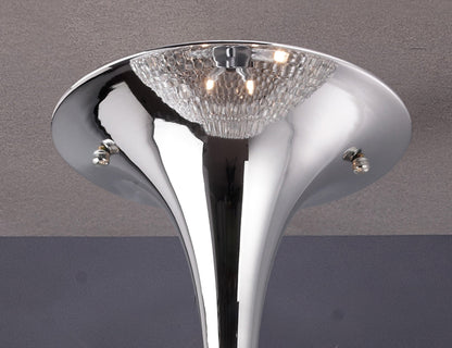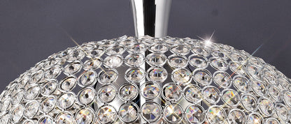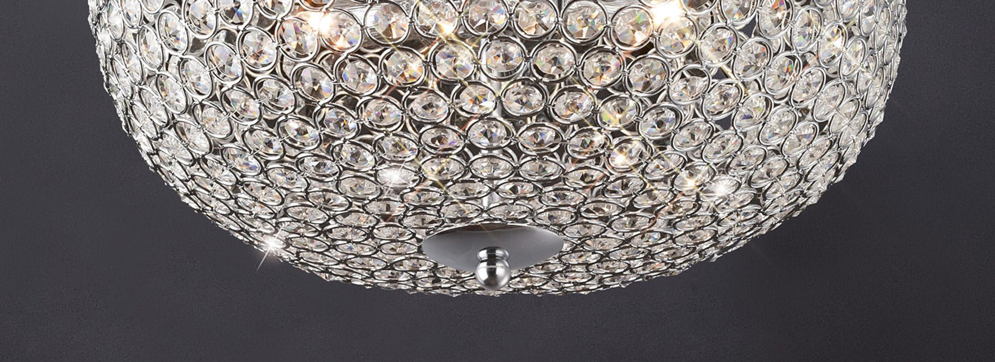 A semi flush selection of ceiling fittings with shades that are a slightly flattened ball shape and supported by a special fluted Polished Chrome stem. Fully loaded with the highest quality of crystal creating a stunning effect.