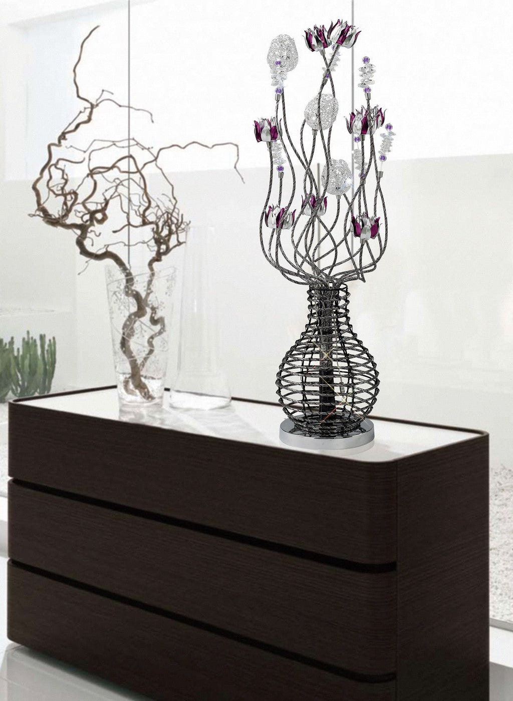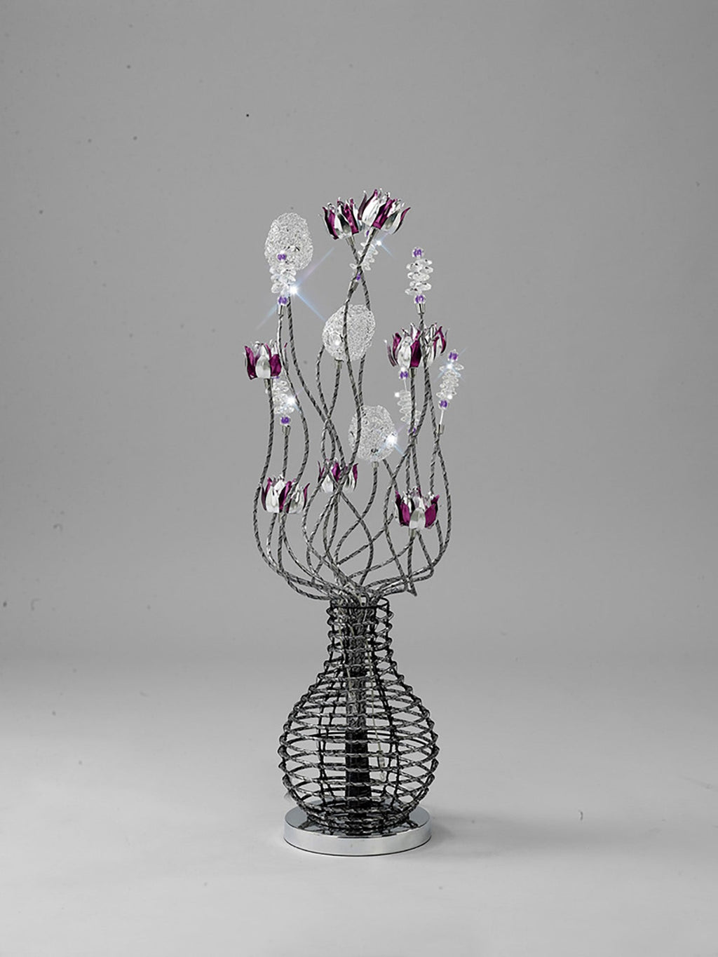 Long spirals lead up to elegant purple flowers and crystal clusters all placed in a black aluminium vase shape base.