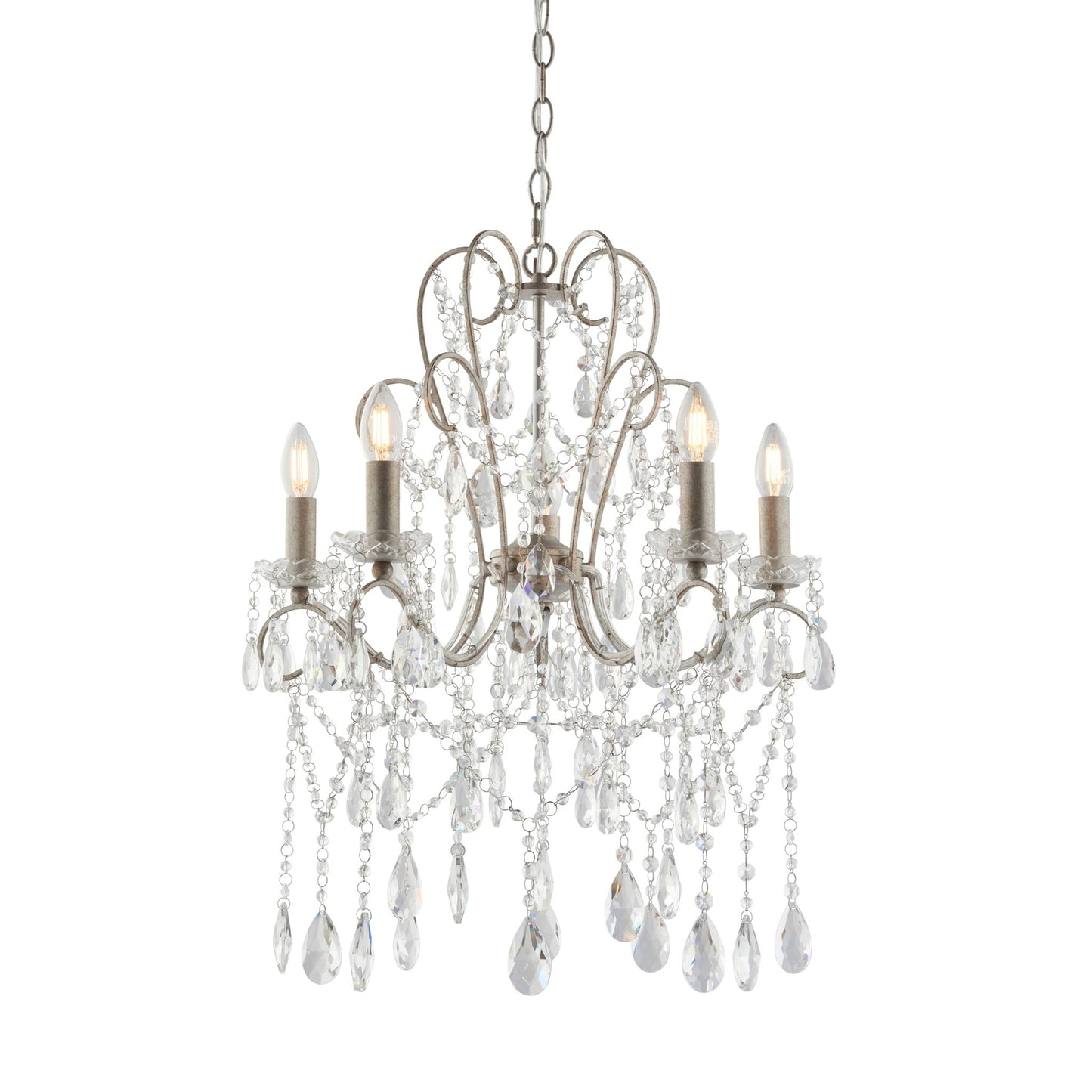 Aged silver framework and candle covers are adorned with sparkling cut glas droplets. Its twisting silhouette  gives this fitting a timeless quality.