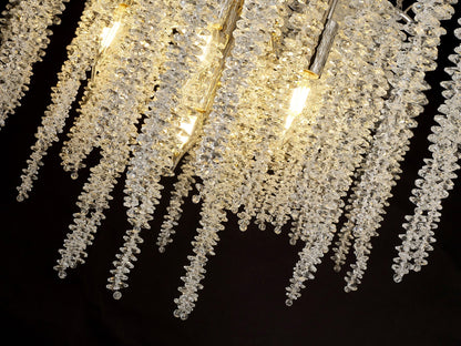 The multiple bunches of crystal buttons delicately suspend from the curved over hanging arms, finished with an ornate french gold or polished nickel which further amplifying the overall aesthetic of Wisteria's natural beauty and elegance.